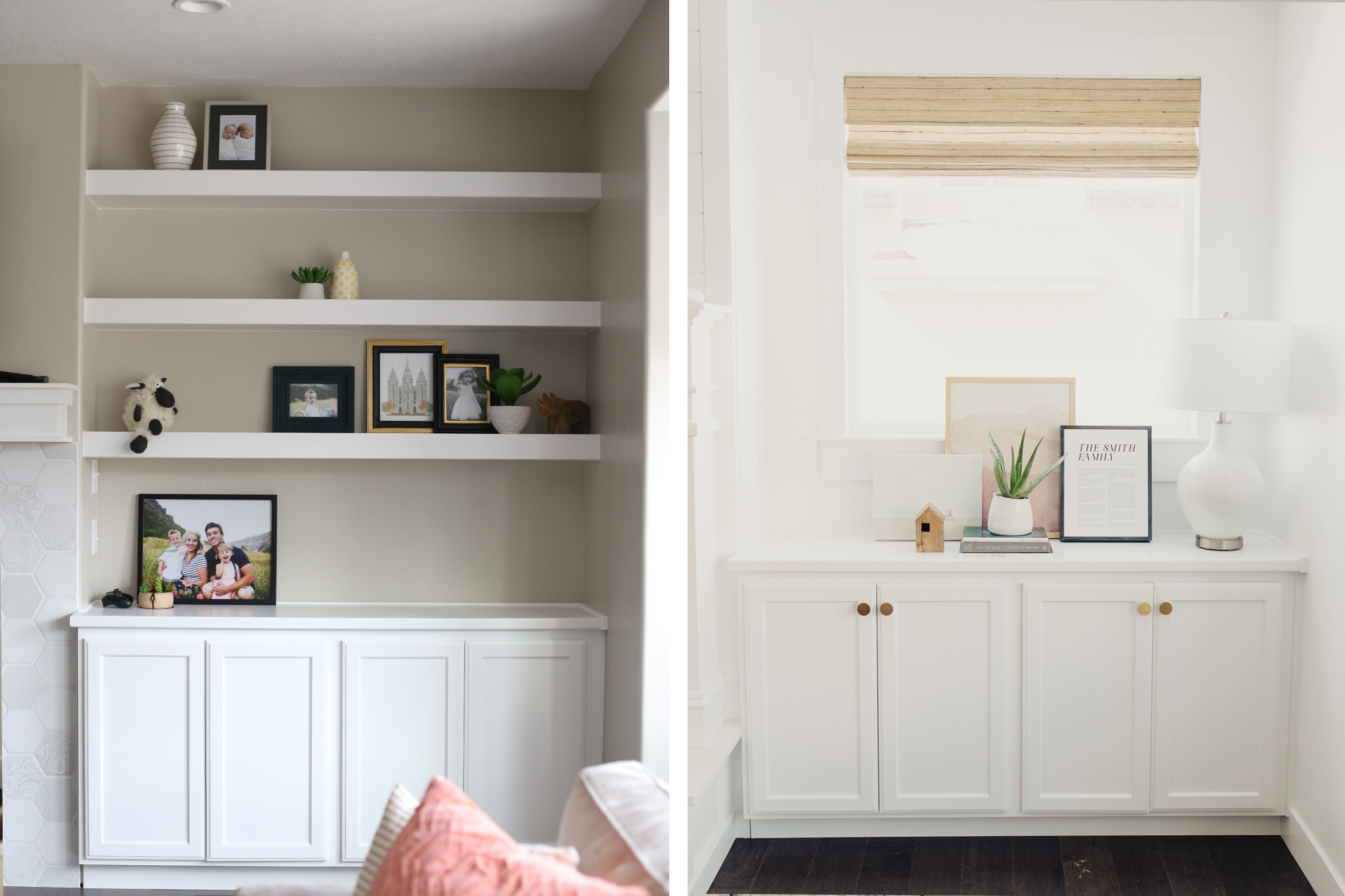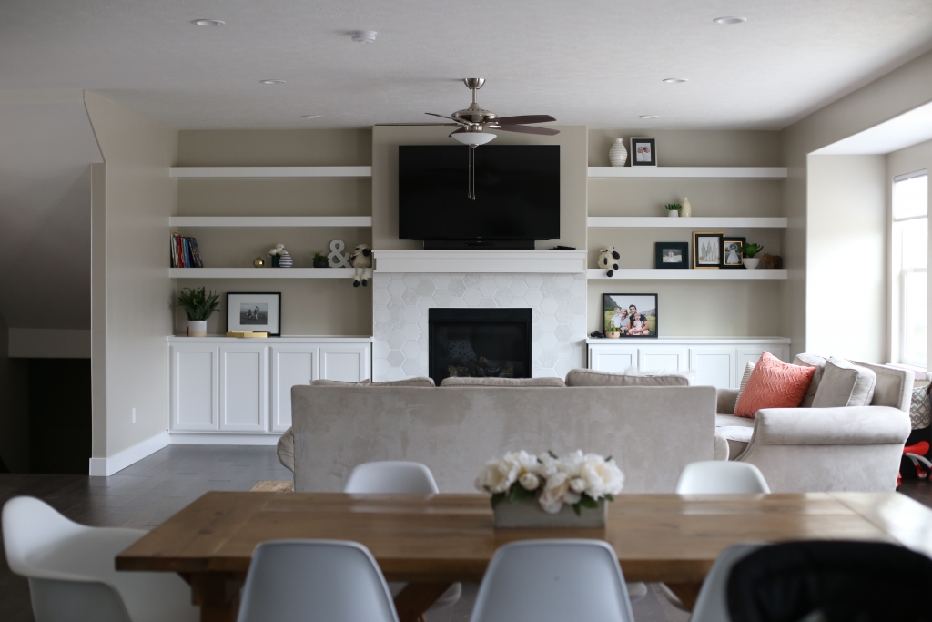 First, we ripped out the shelves and added windows. It changed the space completely! Our original builders (Sweetwater, I do not recommend them AT ALL) used this awful tile, you can’t see the paisley flowers all over the hexagon tiles but trust me, it’s terrible! I’ll eventually update the backsplash in the kitchen, but there was just nothing to the fireplace. The mantle didn’t fit the wall and I didn’t think the style really fit anything else in the house. Also, the cabinets stuck further out than the actual fire place, so it just didn’t feel like the focal point of the room, being dwarfed by a small mantle and large cabinets. I envisioned this beautiful fire place with a mantle and hearth, one that really elevated the room. Nailing down a design was so hard for me! I think I lost five years of my life on that mantle! Then it was the windows. I knew I wanted more natural light and I also knew that those shelves were HARD to decorate. I had tried so many different things and everything just ended up looking cluttery. The problem was they were so wide, much wider than shelves you see decorated nicely on Pinterest, and there were so many of them. So, we ripped them out!!! I honestly couldn’t have pulled the trigger on any of this without Tana.