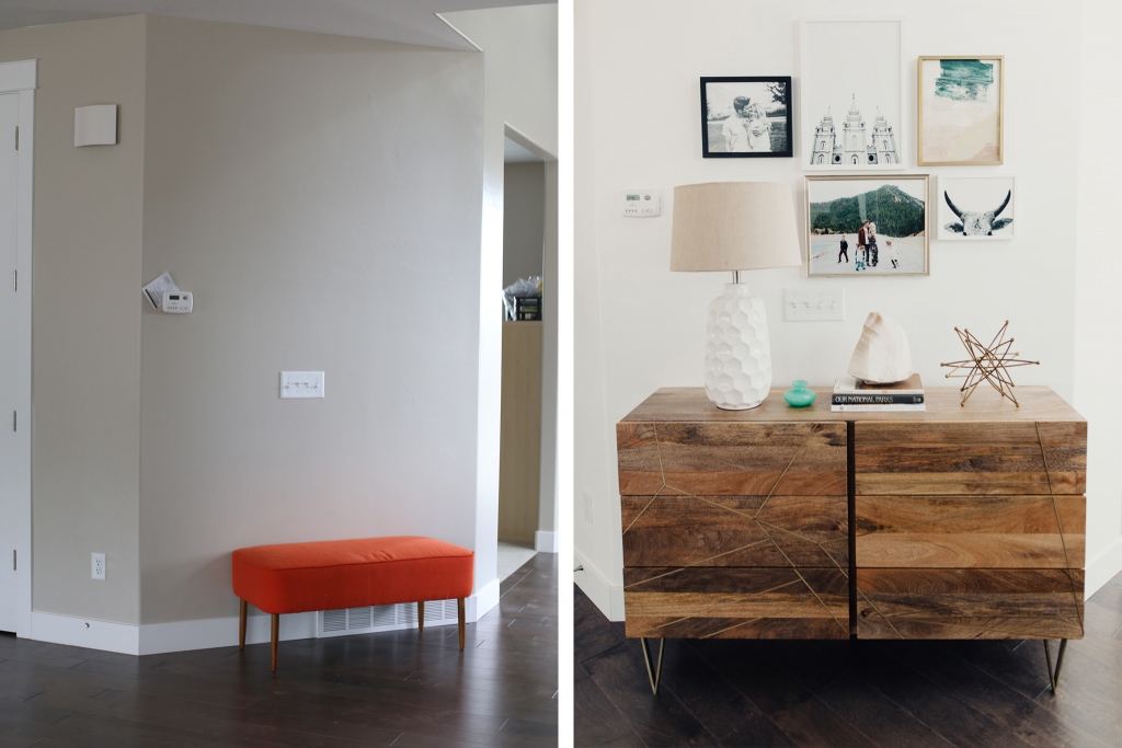 I had no idea what to do with this space. The thought never occurred to me to put a dresser and gallery wall there. Tana did an awesome job designing this space!