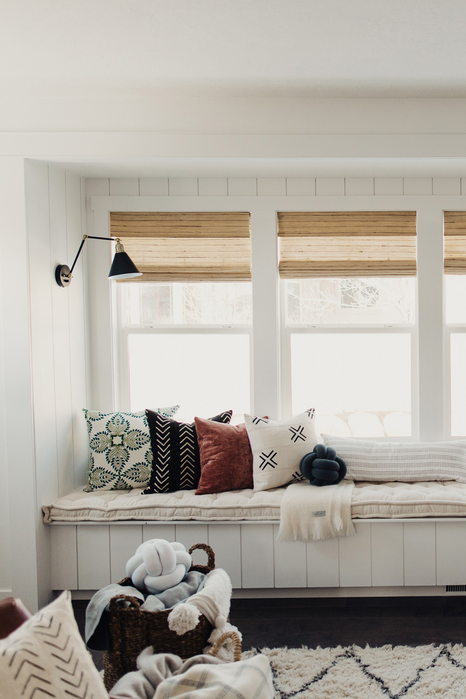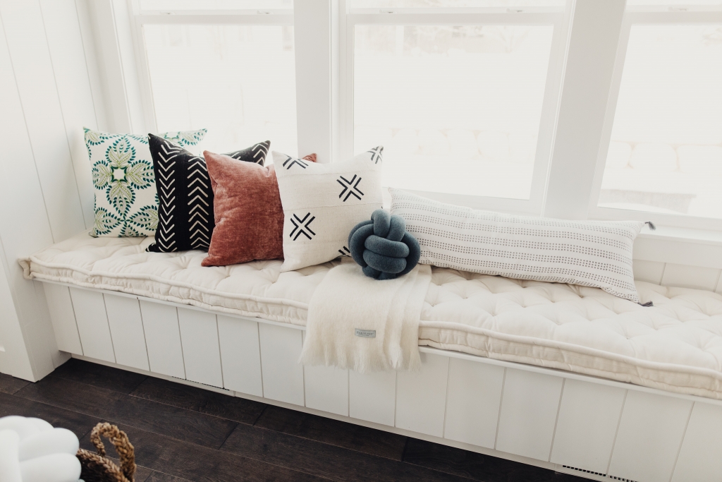 I love this space so much, it’s one of my favorite spots in the whole house. What made this window seat was the pad we ordered from Home of Wool. It’s stunning and 100% wool so it’s soft as can be and cleans up easily. I can’t recommend Home of Wool enough, the seat is absolutely beautiful! The black lights are from Lamps Plus. Pillows from left to right, are the Fern pillow from McGee and Co, a black mudcloth pillow from Danielle Oakey, the Scarlett Pillow from McGee and Co, A white mudcloth pillow from Danielle Oakey and then we have a grey knot pillow from Malia Mu, and the Reem Pillow from McGee and Co. The cream throw is from Harlow Henry and it’s the Luxe Mohair Throw in Cloud!