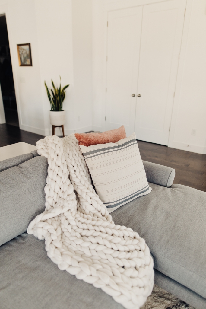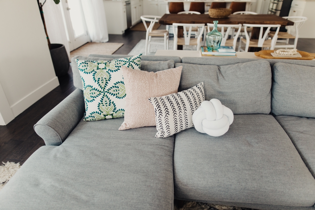 Pillows: From left to right on the couch, Fern Pillow from McGee and Co, two mudcloth pillows from Danielle Oakey, and one knot pillow from Malia Mu. Then we have the chunky knit throw from Sarah Lou Co, a French Stripe pillow from McGee and Co and then one Scarlett pillow!