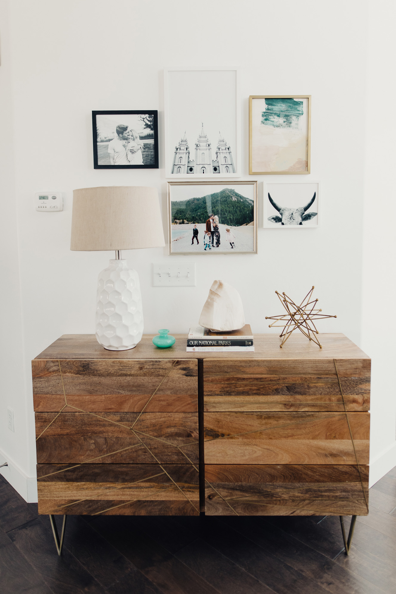We had 2 family photos framed by frame bridge and then we have a SLC LDS Temple from Latter Day Home in a 13×19 with a white frame, The Layers Beneath painting from Minted and a Cow Print. I love him. And then the 6 drawer dresser is from West Elm. The Honey Comb lamp is from Lamps Plus, the awesome rock + green vase is from Sun River Gardens. The books are vintage from @covogoods and the gold sphere is from Houzz!