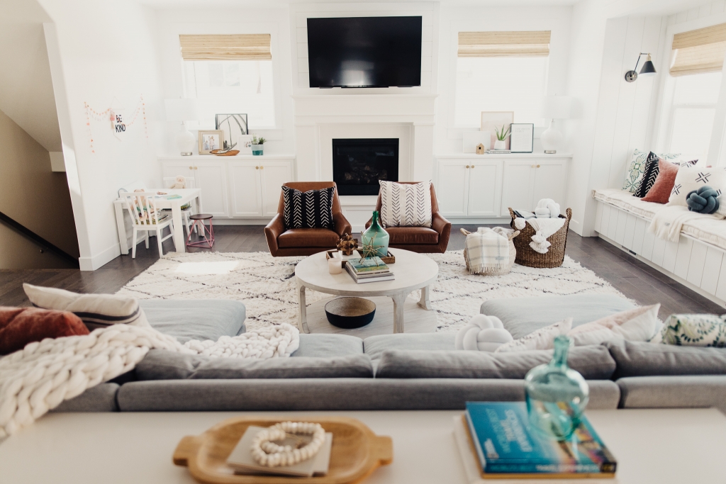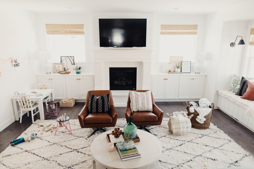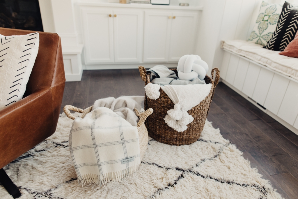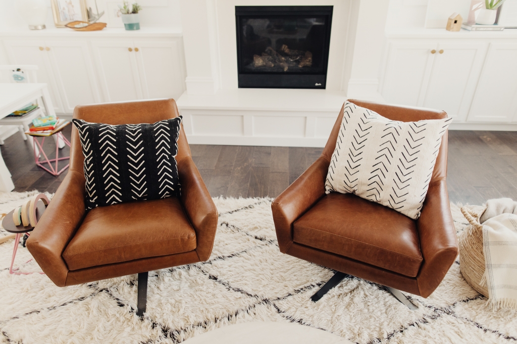 PRODUCTS: The leather chairs are the Lucas Swivel Chairs from West Elm and I am OBSESSED!!! The kids love them and are always spinning and playing games on them! All the Mudcloth pillows are from Danielle Oakey!! She’s reopening her shop soon and when she does, I’ll get you direct links to all her pillows we used. The baskets are from World Market, here’s the larger one and here’s the smaller one. The white Pom blanket is from Danielle Oakey, the grey one on top of it is from Latter Day Home and the cute white knot pillow is from Malia Mu. In the smaller basket, we have two blankets that were sent from Harlow Henry, they’re absolutely stunning and so soft! The first is the window pane Alpaca throw and the luxe mohair throw in cream.
