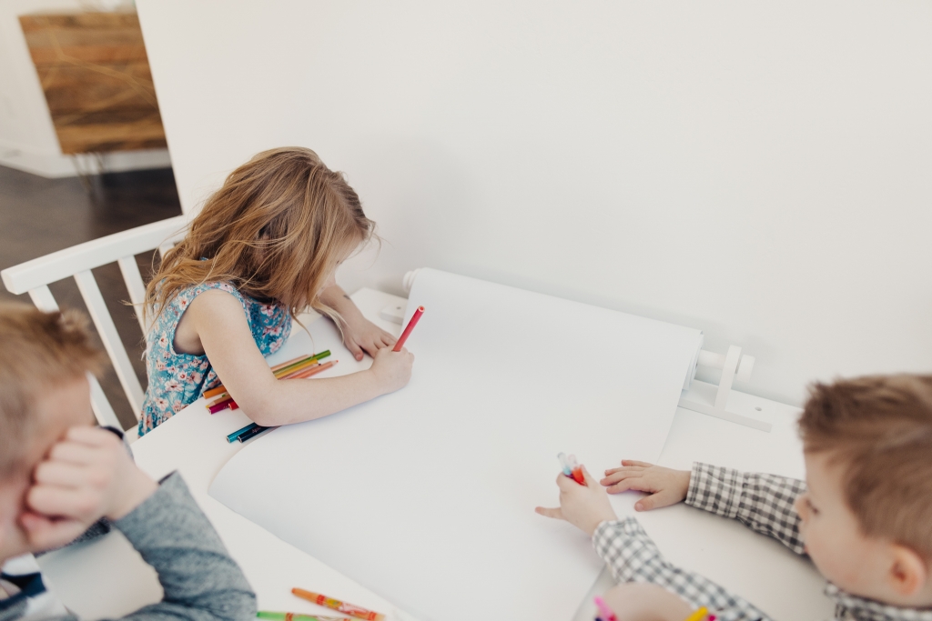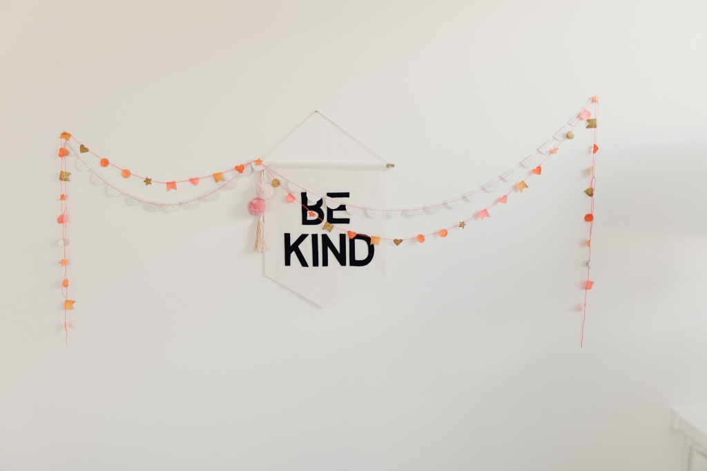 We’ve got this table and chairs from Land of Nod with the roll of paper, and these little linear stools. The Be Kind pendant is from Paper Arrows Studio, the pink garland is from Amazon. The cute little dolls are from BlaBla Kids and my kids are OBSESSED with them!!! We have the yeti, splash the cat and Jaque the hippo, they’re adorable!