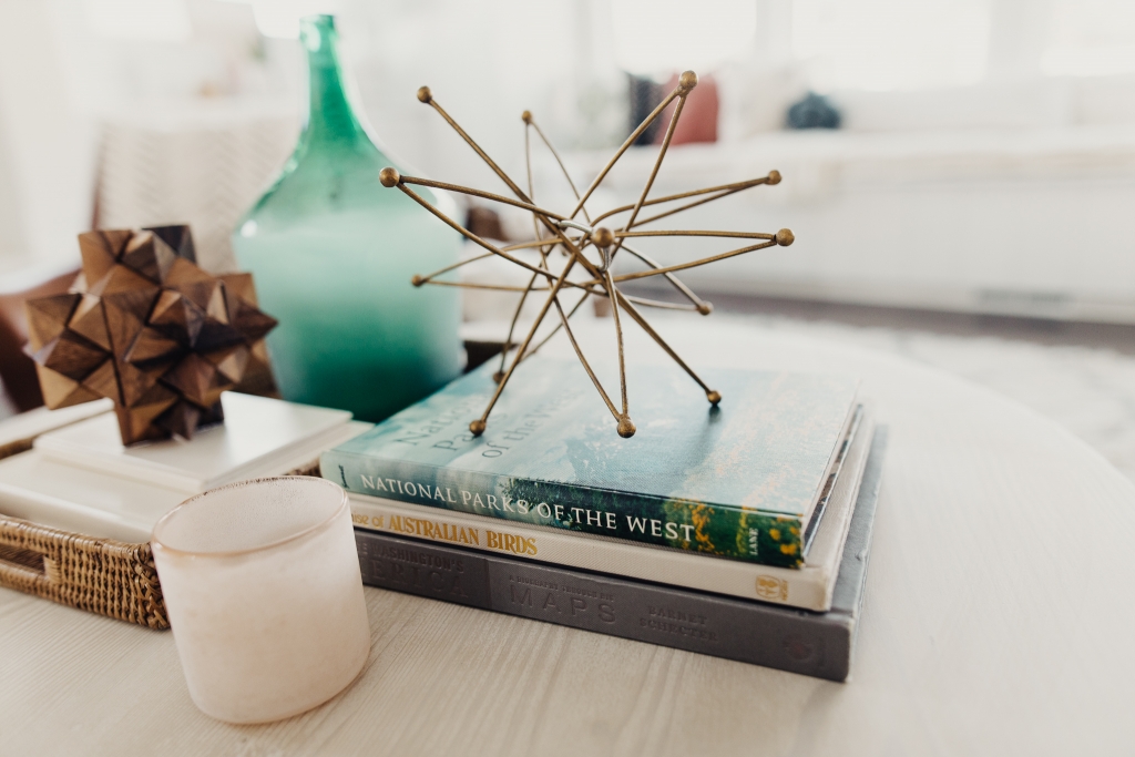 Rattan Tray, Gold Atom Accessories, Wooden Acorn Puzzle (this thing is RAD), Green and pink vase are from Sun River Gardens, and then all the books are vintage from @covogoods!
