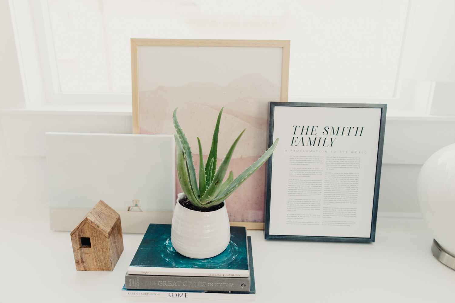 On the right side of the fire place, we have a canvas of the Tower 13 by Minted, then a really pretty pink Mountain Range artwork from Minted, and then a custom Family Proclamation Print from Latter Day home. The little wooden house is from Magnolia at Target, the Aloe plant and pot are from Sun River Gardens, and the books are vintage from Covogoods.