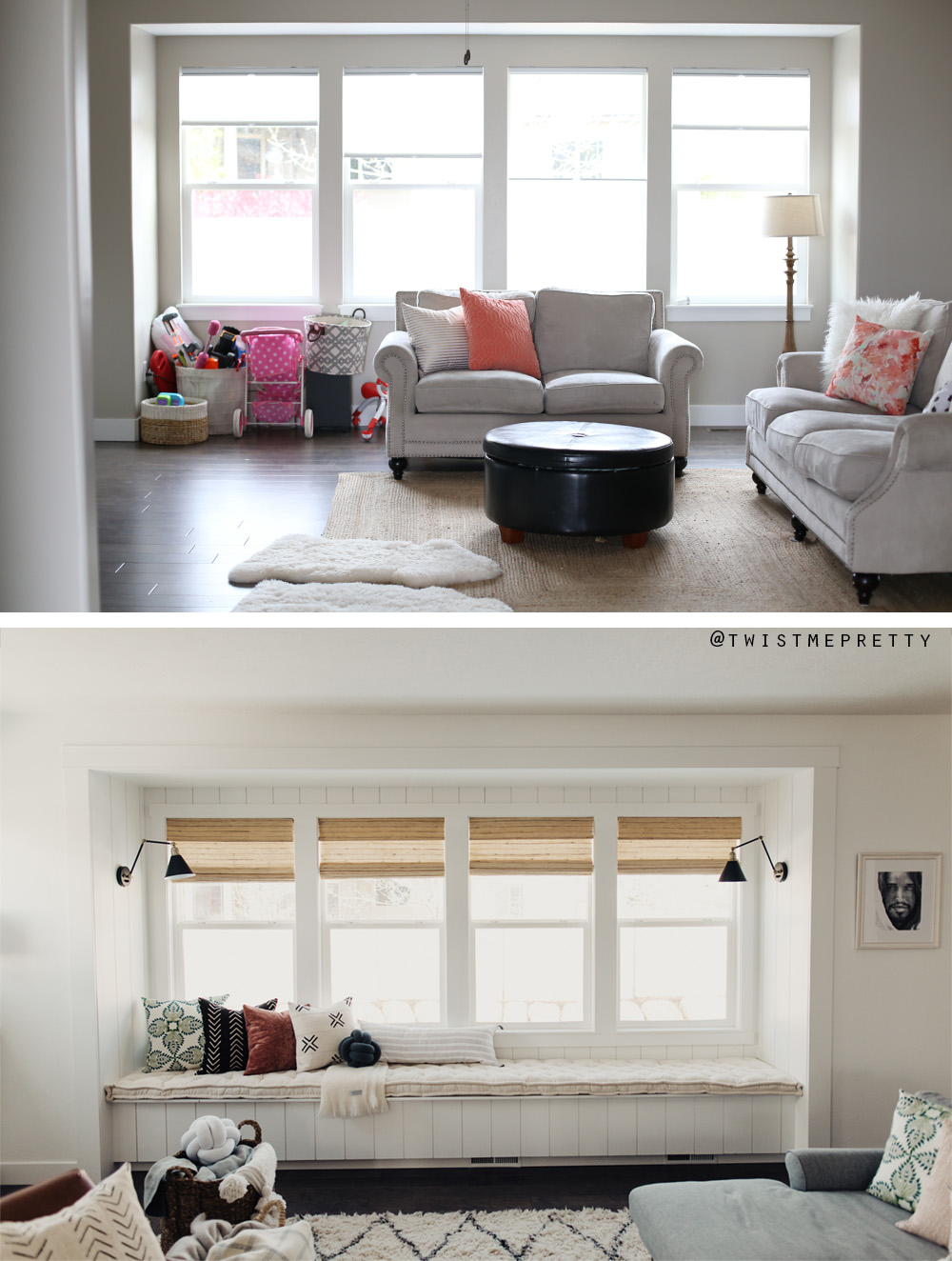 I was out out town when the demolition happened, which is why we have zero pictures, but it took about a week for them to knock out the windows, frame everything out, build the window seat, shiplap, and paint. We got our first bid though, the beginning of August and they were finished the end of October. The work doesn’t take forever once they get started but scheduling contractors and getting all the supplies in takes forever!!