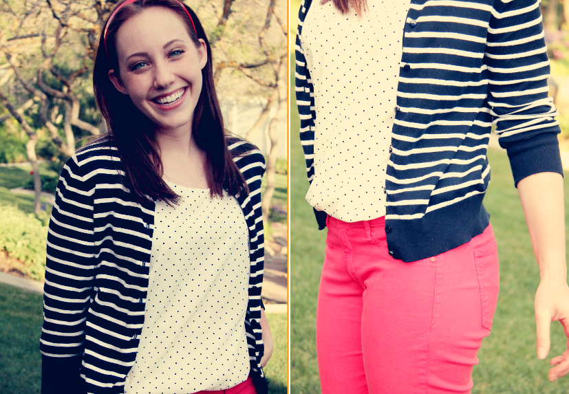Remember my gorgeous little sis? She’s back. And don’t worry- I totally forced her into doing this for me. She has this amazing sense of fashion though! Story: Two years ago my older sister Mel and I kept making fun of how she was dressing. Behind her back of course. HA! She was always wearing blah neutral colors. Mel and I were like, “Hey GRANDMA, tone down that outfit”! And she’d say “You guys just wait. I’m building a wardrobe here”. And were like… yaaaaa suuuure. Fast forward two years and Mel and I are still wearing our cheap Old Navy clothes that never fit the same after their washed and Hayley has finally built up her wardrobe. She’s totally showing off bright colors and crazy patterns. We hate her. Well we would if we didn’t want to be just like her! She started off with boring staples though. A few white blouses, a navy blue blazer blah blah. She saved her money and bought nice clothes slowly. And now she’s got this amazing wardrobe filled with really great clothes. I don’t want to say expensive clothes because I know she shopped sales and found good deals but they weren’t cheap. And now I’ve just wasted a bunch of money on cheap crap I have to re-buy next season. Don’t you hate that?!Without further adieu- here is Hayley! Gotta lover her!
