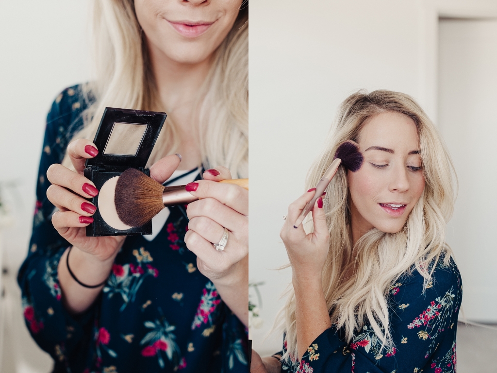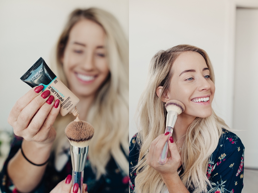 And then I’m buffing the L’Oréal Infallible Pro Glow foundation in the shade nude beige into my skin. I’m just using a dense, domed foundation brush. I really love this foundation, it’s full coverage and wears well all day!! The key is to set it with powder when you’re done or it will slide around a little bit.