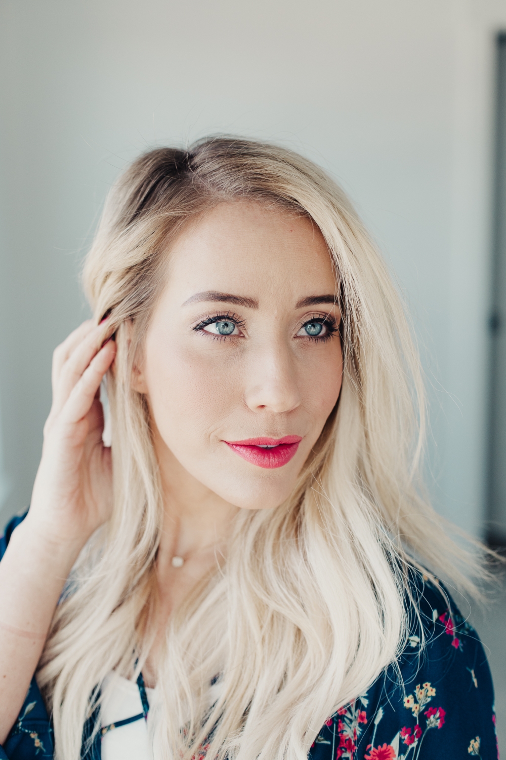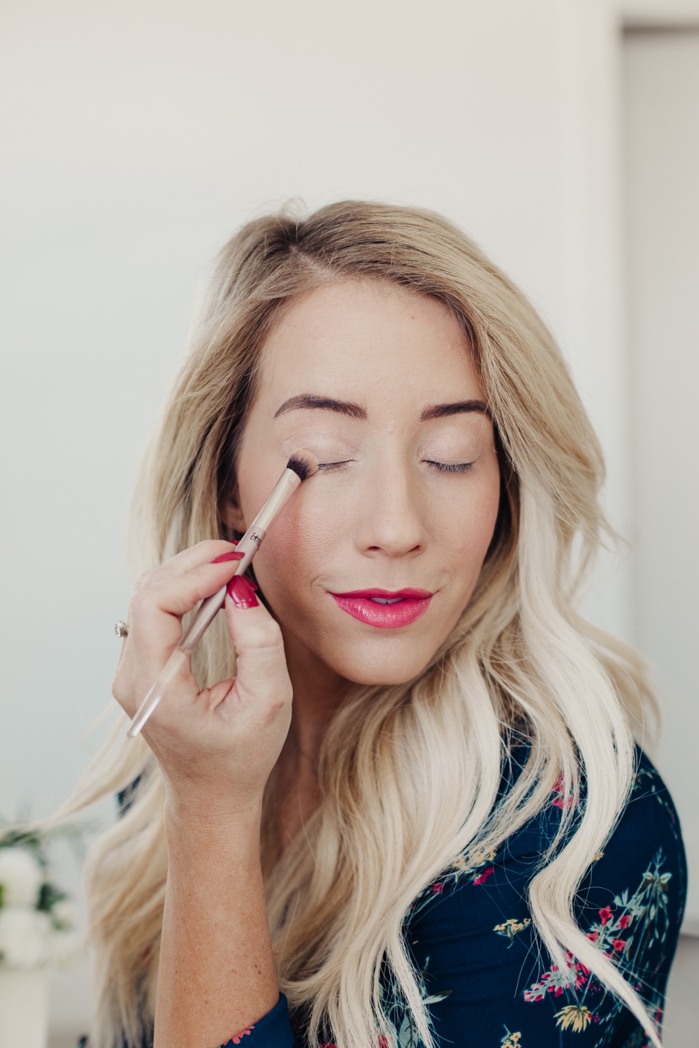Then with that same brush, I’m taking the metallic pink and the dark brown and darkening up the outer crease. Make sure that everything is nice and blended! As a substitute to eyeliner, I like to take the dark brown color and sweep a little bit of color right below the lower lashes. Instead of a harsh line, you get a really pretty pop of color and it opens up the eye! You can watch this video tutorial if you’re looking for a better explanation of how I actually apply shadow to my lids!