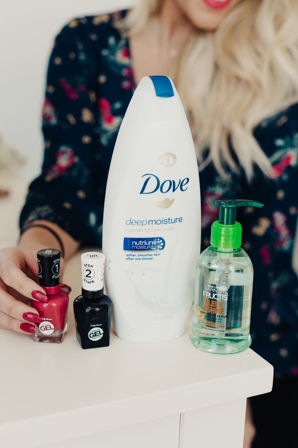 And then we’re done with the makeup!!! A few other products I really love is the Dove deep moisture body wash, it makes my skin so super soft!!! I’ve been using the Garner Fructis Sleek and Shine Oil which hydrates the hair and adds back in a luminous shine and then my nail color is the Sally Hansen Gel Nail Polish in the color Frill Seeker. This is one of my favorite products to use when I don’t actually have my nails done because it lasts so much longer than regular polish!!