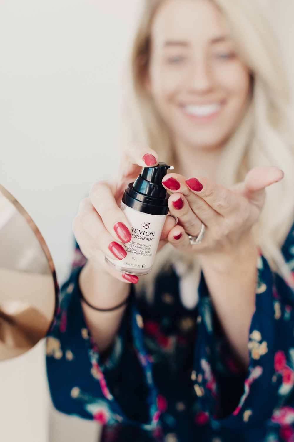 To prime, I’m using the Revlon Photo Ready Perfecting Primer. It has a thicker consistency but I feel like it does a great job of minimizing my pores and helping my foundation go on super smooth!!! If your skin is dry or your having problems with your makeup creasing of coming off, make sure to use a primer!