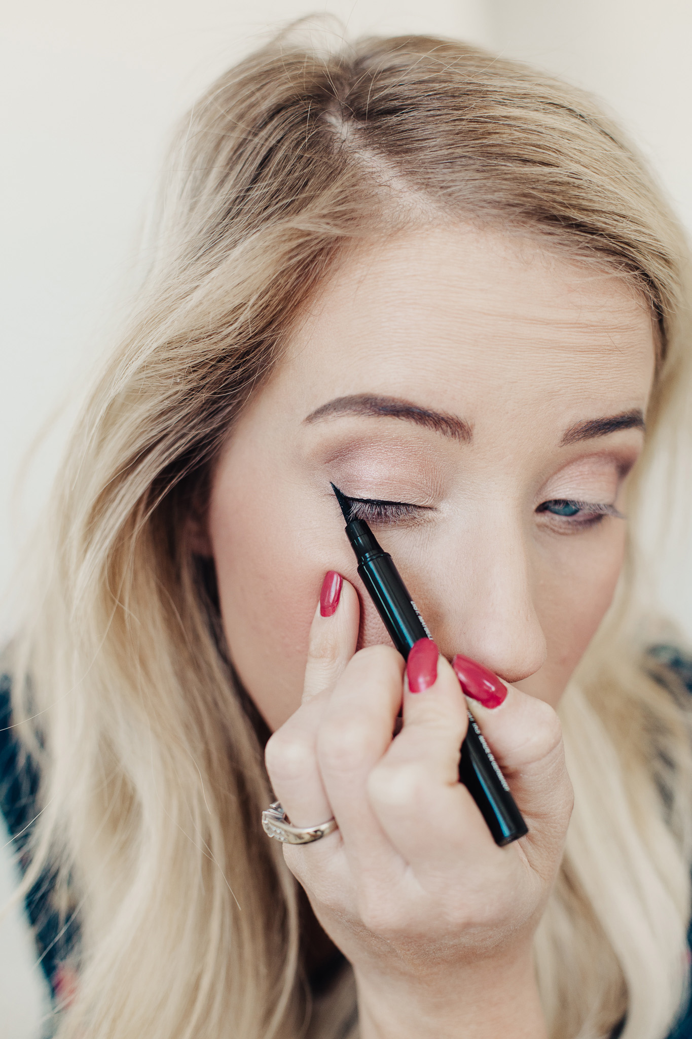 Then I’m using the liquid liner by Covergirl and giving my eyes a slight wing. I like to use the shape of the tip to stamp the shape of wing I want and then without lifting the “stamp” I drag it up. Then draw liner from the other side to meet with the wing.