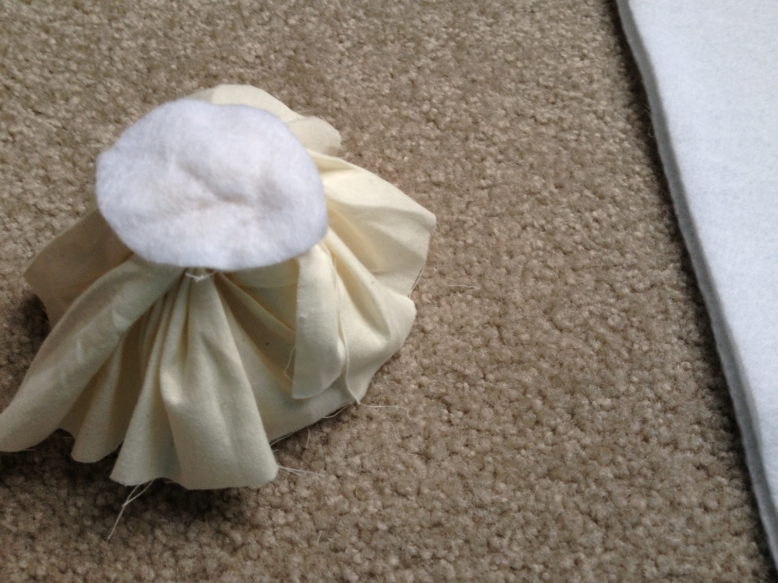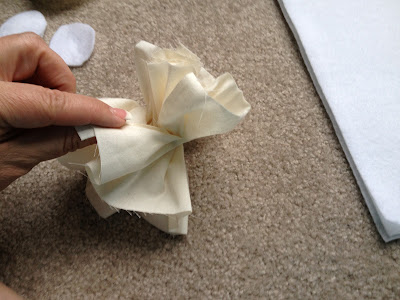 I cut a felt circle base for each muslin flower I made. They are not going to show so don’t be too fussy. I just folded the felt in half and cut a half circle on the fold.