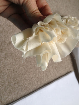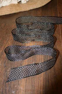 Using the original fold in the muslin I cut strips of Muslin (about 6″ wide) across the fabric. I just eyeballed it. You want some slightly bigger and some slightly smaller so you’ll have various sized flowers. Cut as many as you want. I don’ even know how much I used. I just kept making flowers till I liked the way my wreath looked.
