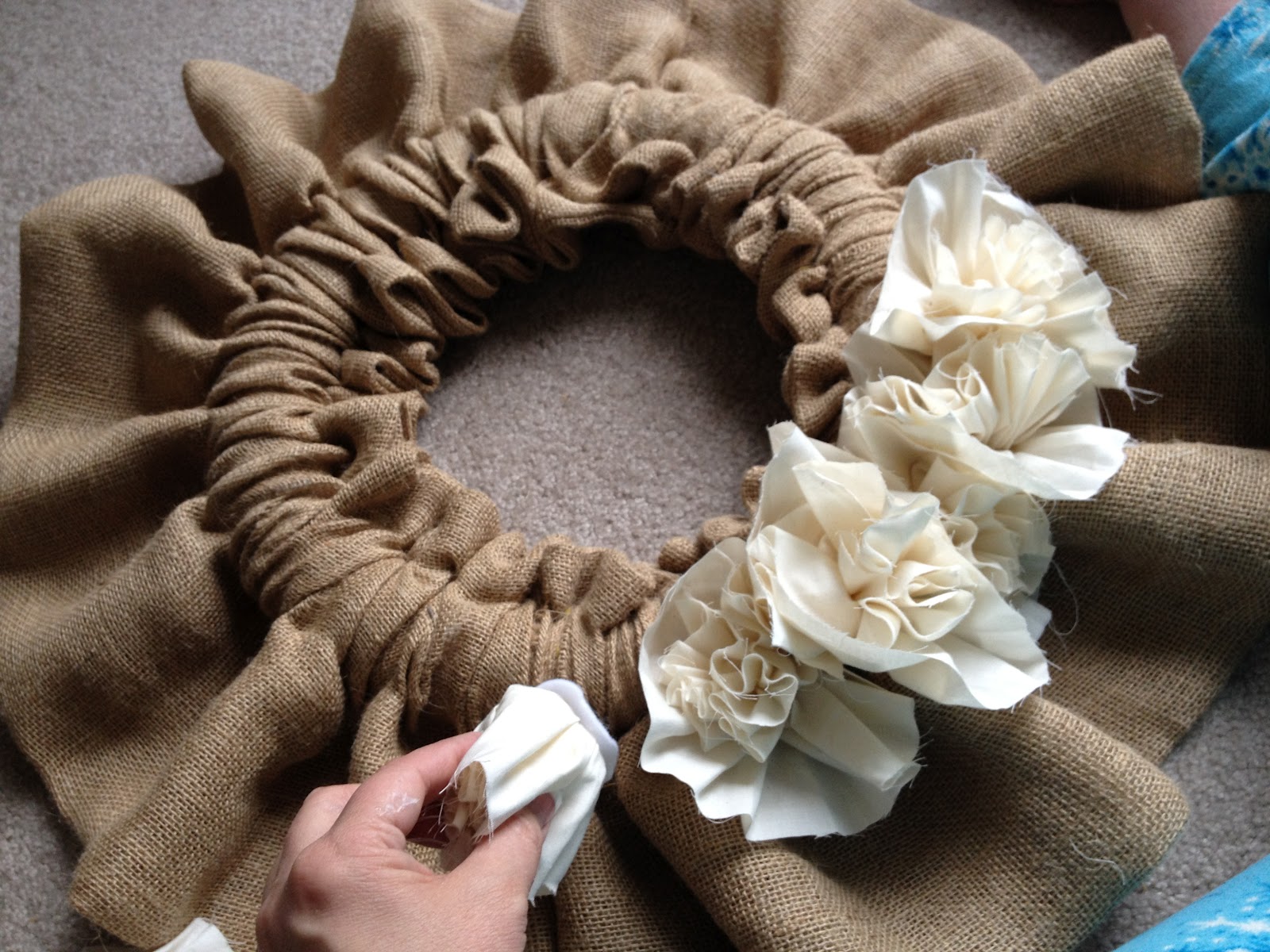 Start gluing your flowers onto your wreath. For the most part I put the bifger flowers in the middle and kind of tapered the edges. You don’t have to do it exactly like I did. Just do what looks good to you.