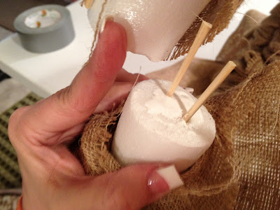 When you get to the end. push pieces of a wooden skewer (about 2″ or 3″ long) into the Styrofoam. Stick them in deeper than mine are in the picture. You need to be able to get the other end on it. Put a glob of hot glue or quick drying craft glue onto the end of your Styrofoam and push the ends of the wreath together using the wood skewers to hold them together. Wrap the Styrofoams seam with duck tape. My wreath had broken in half so I did this on each section. Wrap your burlap ends under and secure with straight pins. Hide the pins so they don’t show.