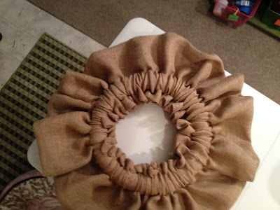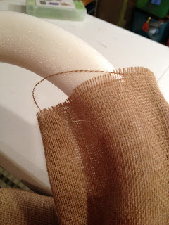 I used a Styrofoam wreath that I bought at Walmart, but use what you have. As long as you can slip your burlap around it, it will work. I cut a slit in the wreath so I would have an opening to enable me to slide the burlap on. My wreath ended up snapping in half, but it was easy to fix. I’ll show you in a second.