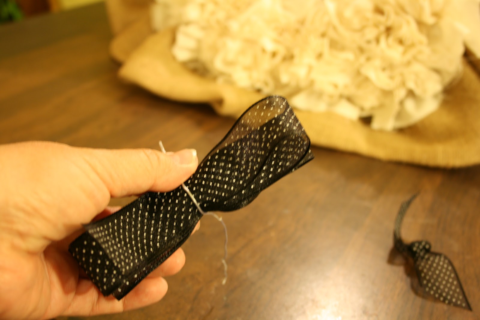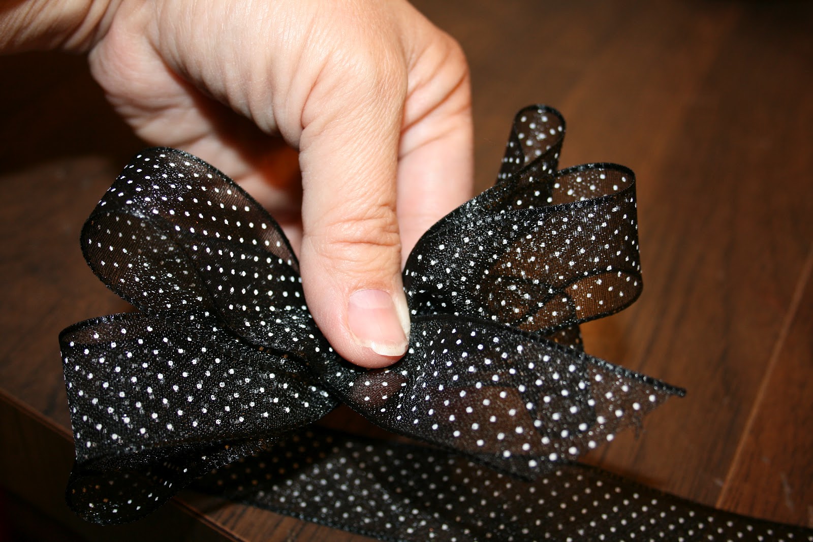 Wrap bow with wire, then wrap knot around bow and secure with hot glue. I used three diffent kinds of ribbon and mede them differe slightly in size using the biggest bow first so they would gradually taper.