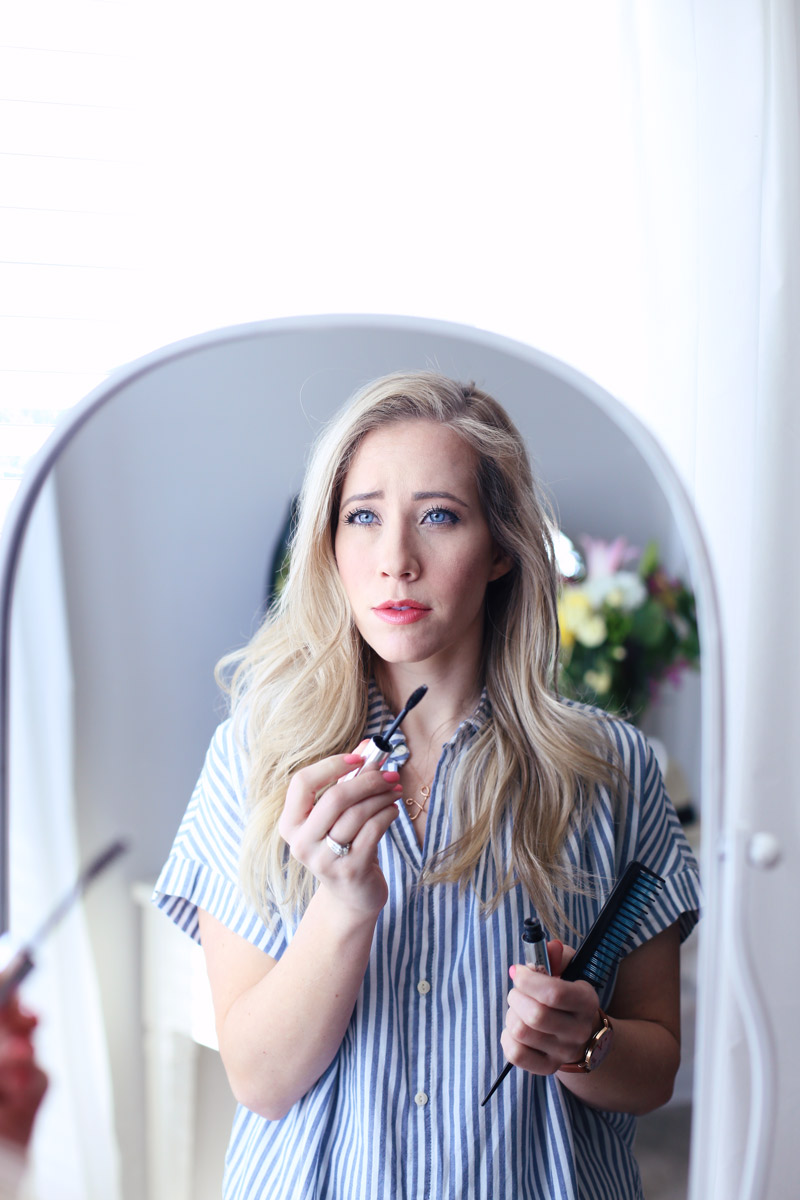 ^^ If you have excessive fly-a-ways, or in my case postpartum regrowth, a little trick I’ve been doing is taking my eyebrow gel and smoothing the hairs down with the little brush!! Afterwards, you’re going to tease the roots to give yourself some volume and if you want some extra texture go ahead and spritz some Living Proof Texture Mist onto the hair! Once you’ve sprayed it on a section, scrunch up the hair with your hands and it’ll bounce up and revive those curls! Occasionally I will retouch a few sections with the curling wand but I like the loose waves so as long as there isn’t any frizz and it looks smooth and healthy, I usually leave it alone.