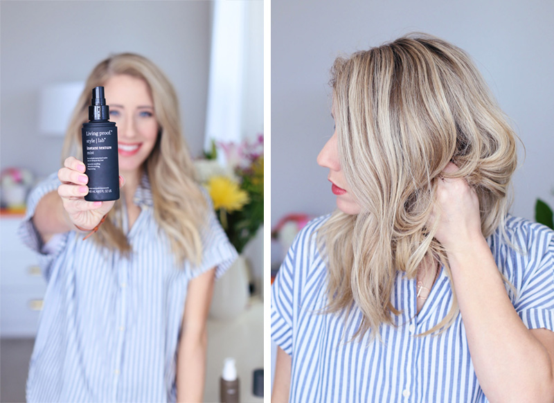 Step 1. You’re going to brush through any snarls with a paddle brush and then spray in some dry shampoo. My absolute favorite dry shampoo is from Living Proof; you guys already know this. It absorbs and removes any oil, sweat and odor and doesn’t leave any residue or powdery build-up behind. And how cool is this, it has time-released fragrance which delivers a light, clean scent throughout the day! It’s hands down my favorite and the bottle lasts me forever!