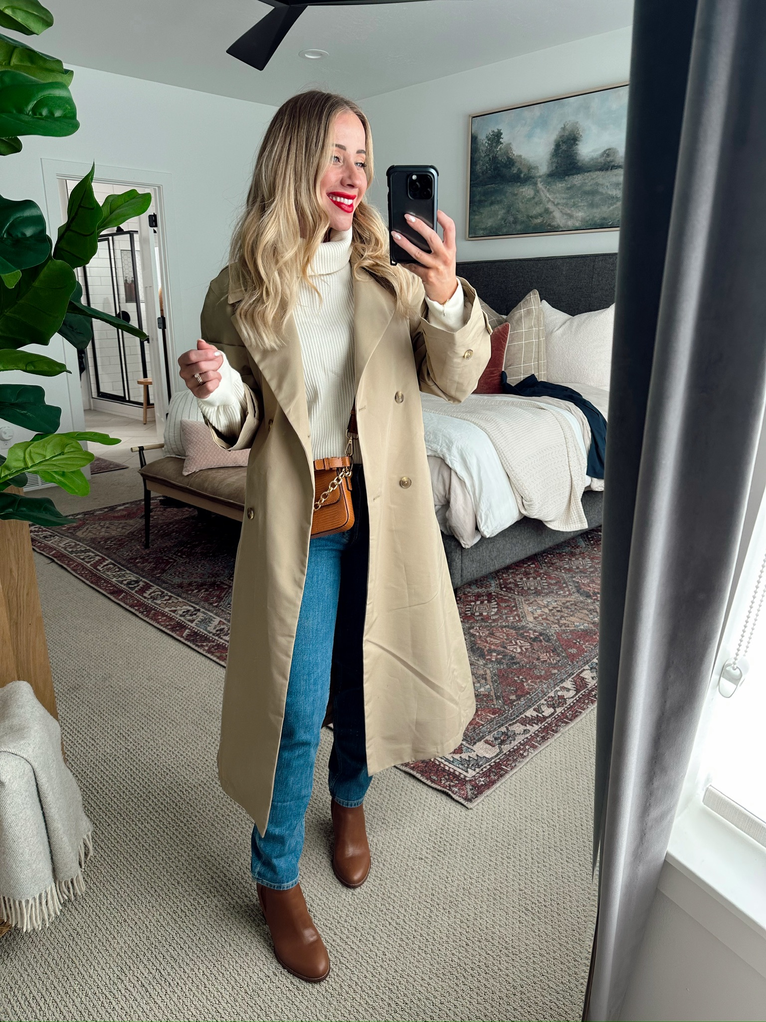 TRENCH COAT / WAFFLE MOCKNECK / JEANS / BOOTS