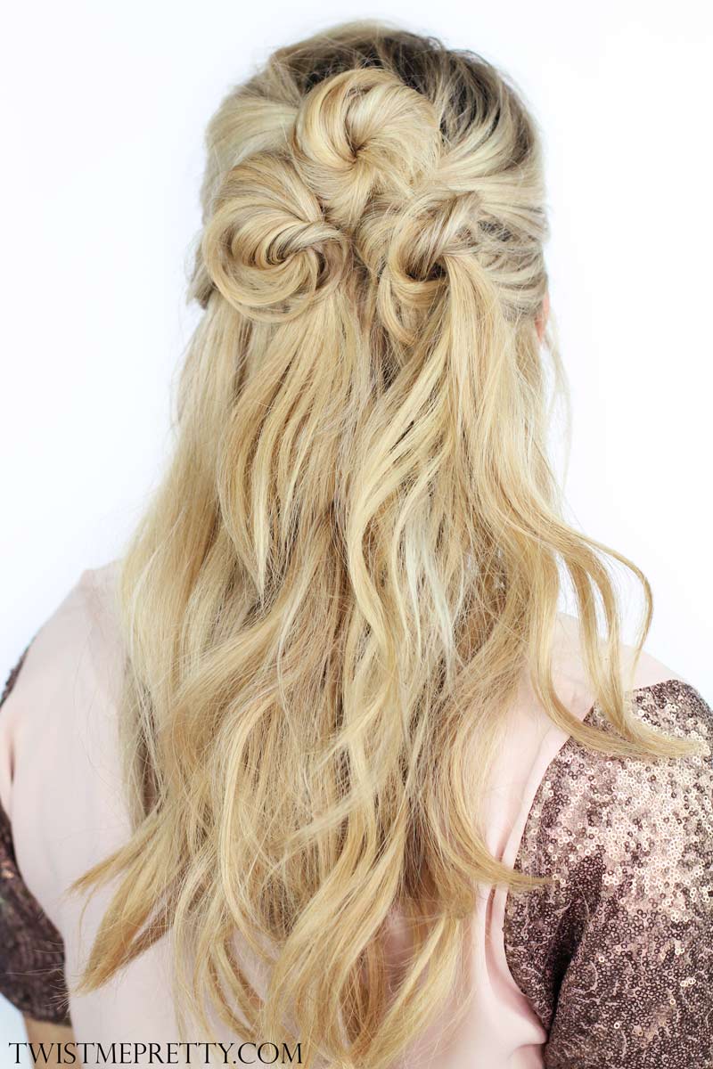 3| Gather another section below the first bun/rosette and wrap it once or twice around, which ever your prefer, making sure to leave some tail out of the bun before you secure with criss cross bobby pins