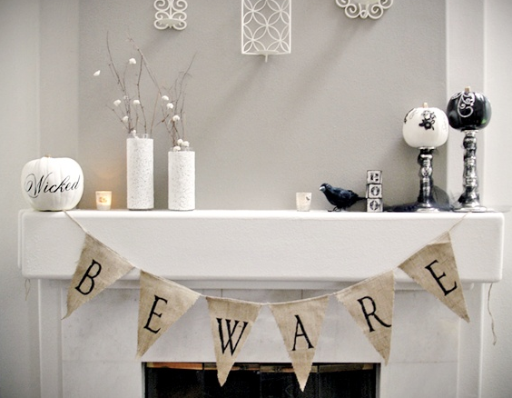 Now I’m not loving all those pumpkins near the fireplace. There’s just too much goin’ on. But I do like the empty frames and the halloween banner with the cheese cloth.