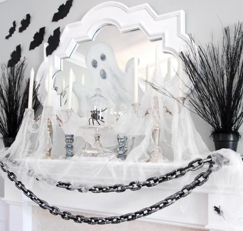 Classy and white. Instead of a banner… a chain! Love the ghost in the mirror too.