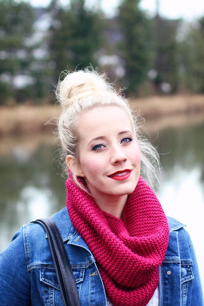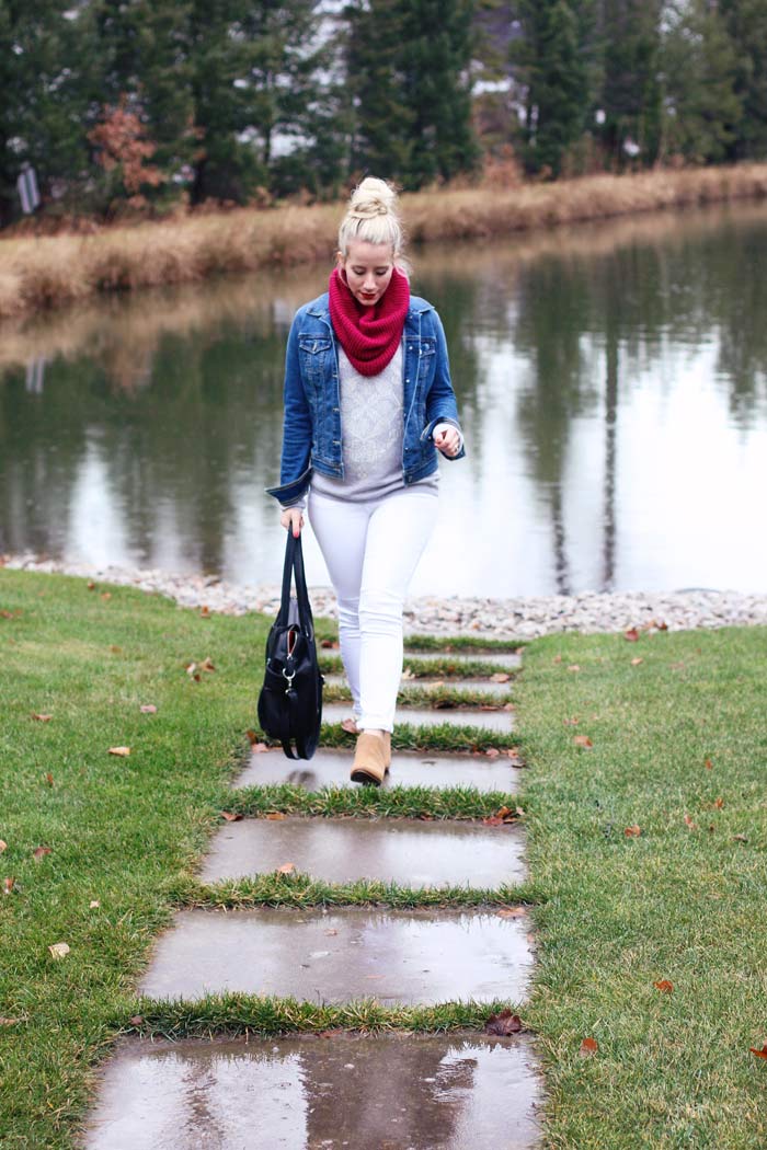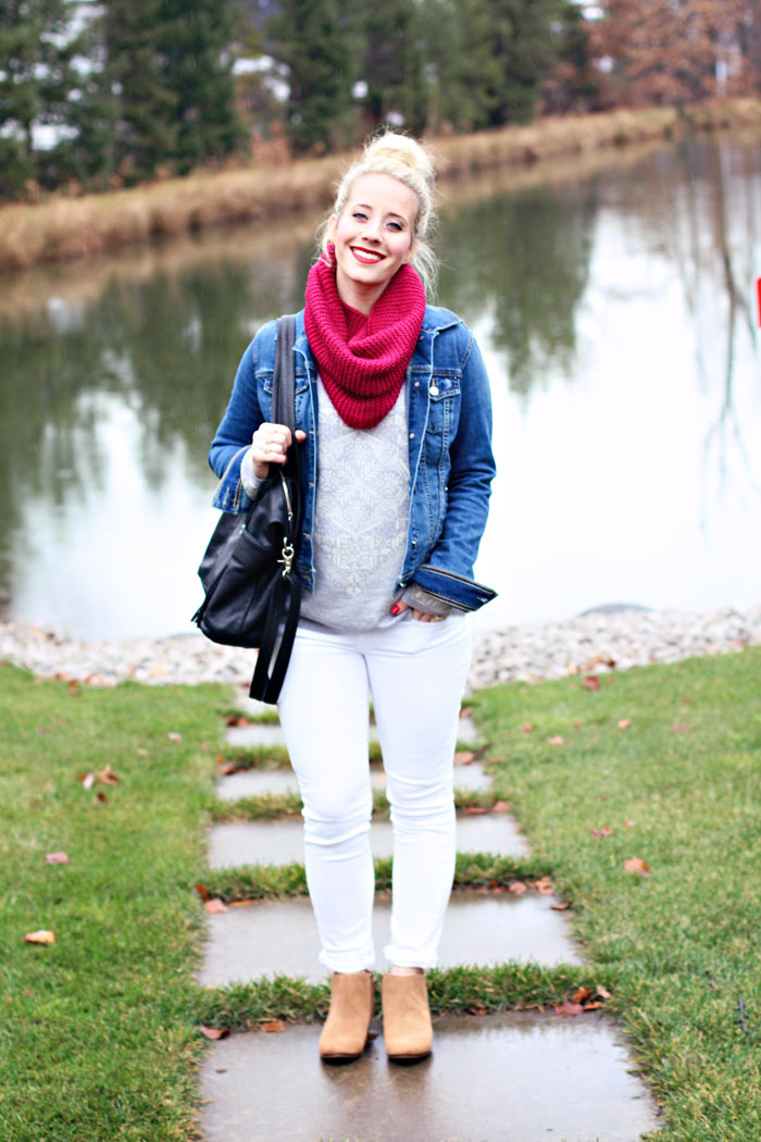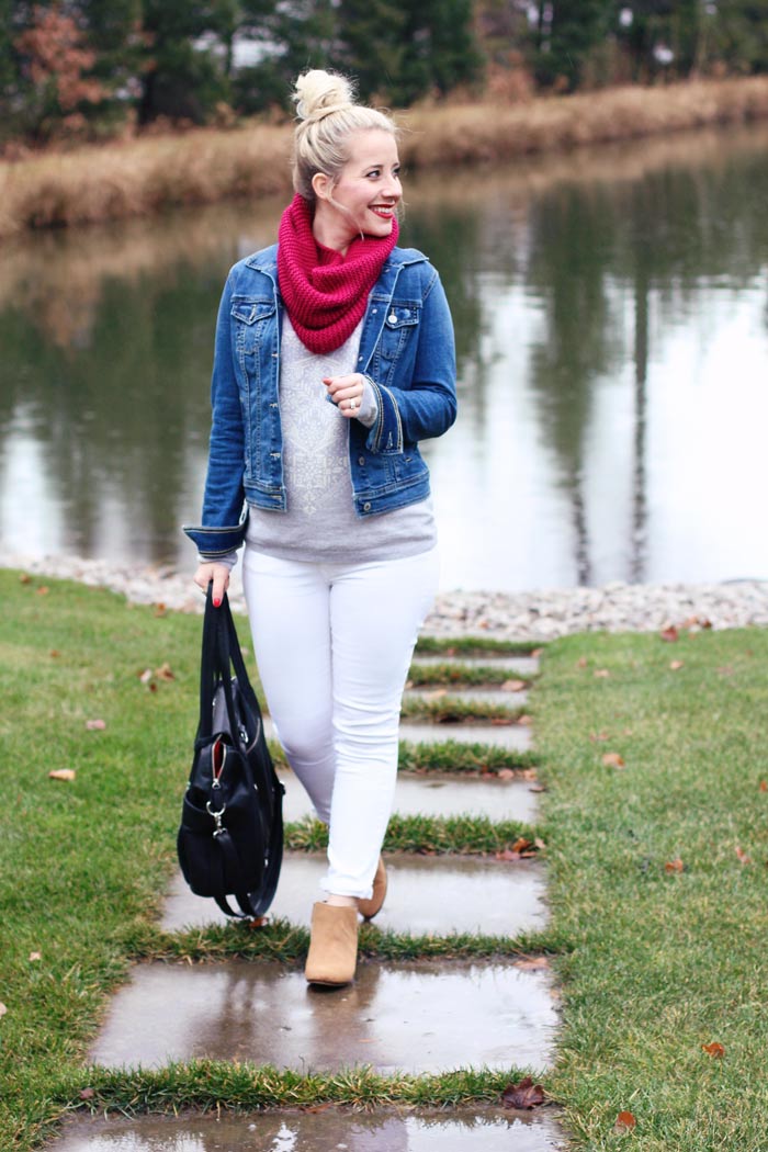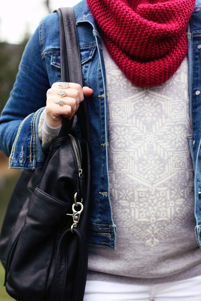bag: c/o lily and jade | denim jacket: old navy | white jeans: american eagle | booties: marshalls | sweater: marshalls | infinity scarf: old