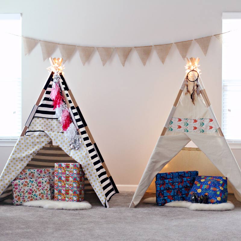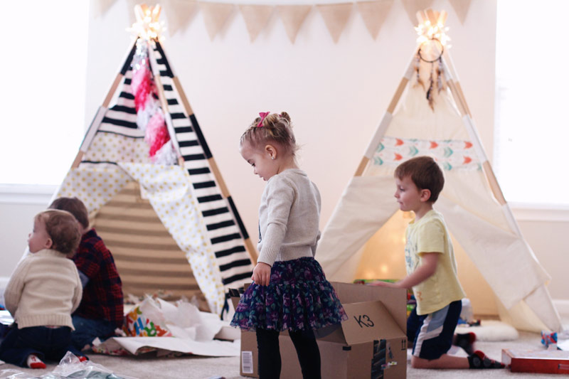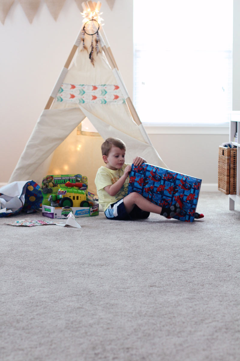 The kids’ birthday weekend started off with the most amazing Christmas like Birthday morning ever. I mean… how can a house not just oooze in happiness when there are two gorgeous, and lighted might I add, teepees full of birthday presents? The answer is it can’t. It was amazing. And I’m pretty sure Brian and I now need a teepee for ourselves! You can find the black and white teepee here and the natural arrow teepee here. They are both from the Tnee’s Tpees and I ended up getting the six footers. I spent hours and hours trying to decide what size I wanted and ultimately I felt like splurging on the bigger size was going to be worth it. And it definitely was. My kids are three and five and if the teepees had been any smaller, I’m not sure how much they would have ended up playing in them. This way we can turn the teepees facing each other and they can go back and forth from Savy’s to Boston’s or they can both play in one with enough room to spare. Plus they make me happy seeing them in our living room and they hide toys flawlessly. Win win!