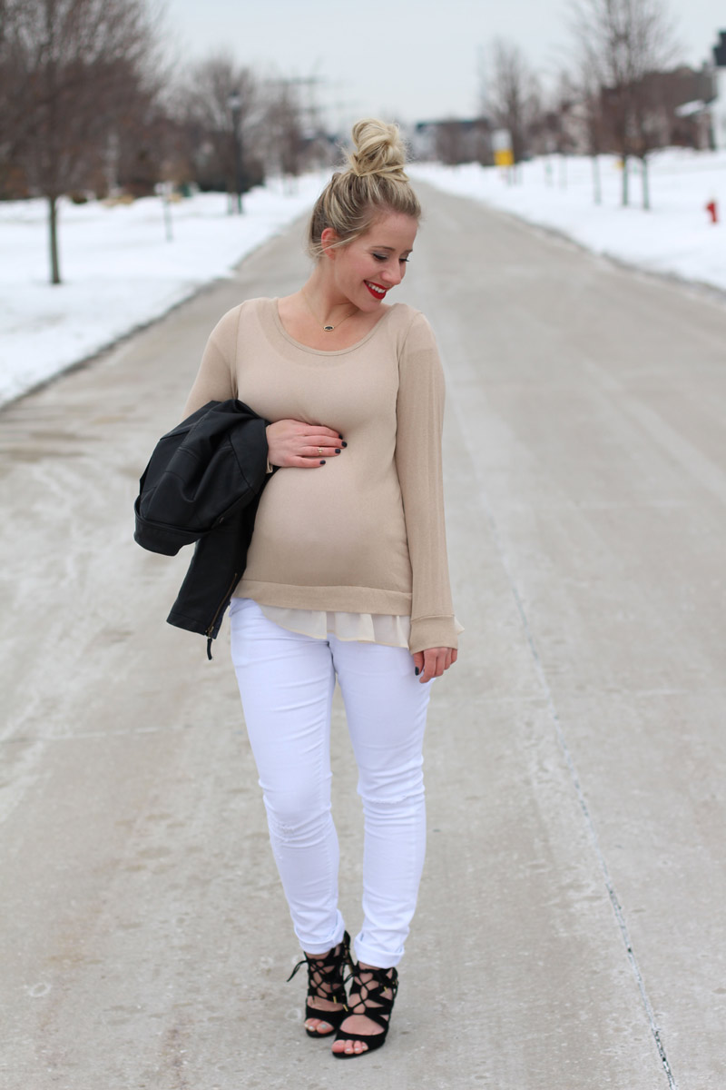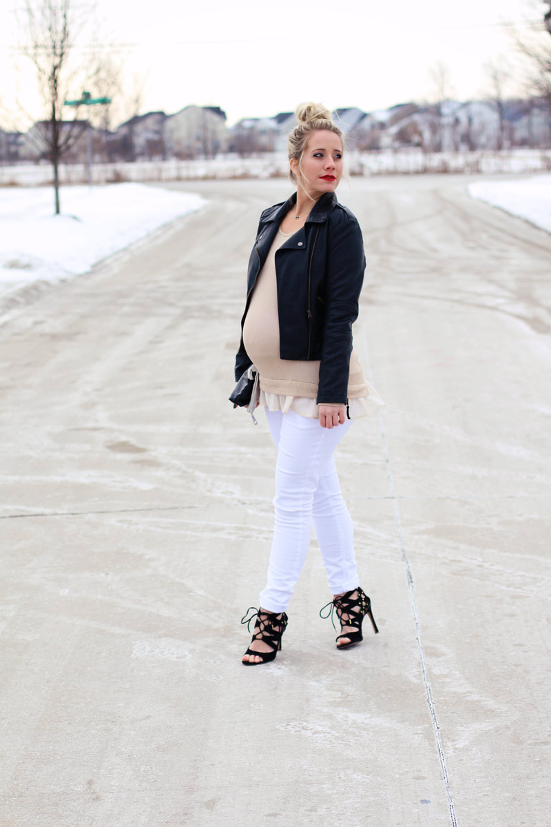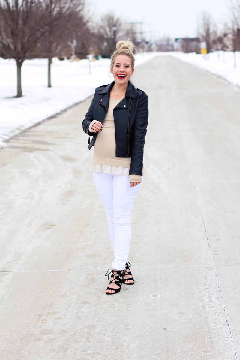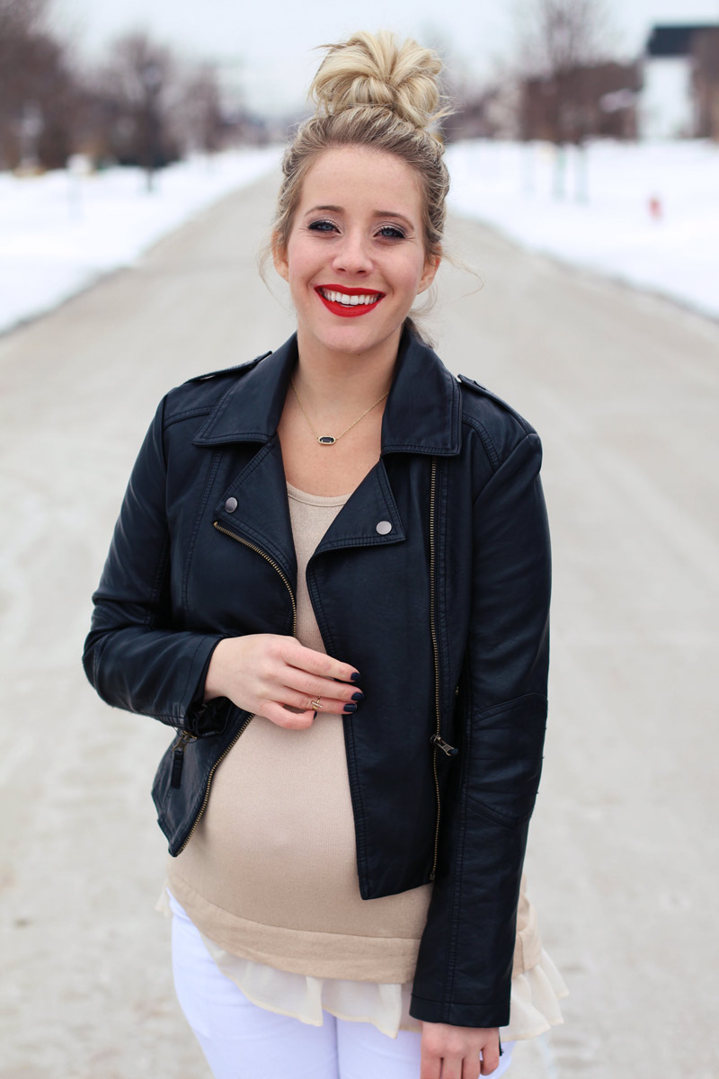 Cream Blouse: c/o Novae Clothing | Jeans: Asos Maternity | Leather Jacket: c/o Choies similar splurge here similar save here | Caged Heels: Nordstrom, similar here and here | Lips: Mac’s Russian Red | Necklace: c/o Kenra Scott | Ring: c/o Sole Society