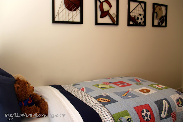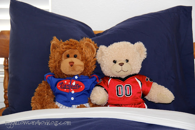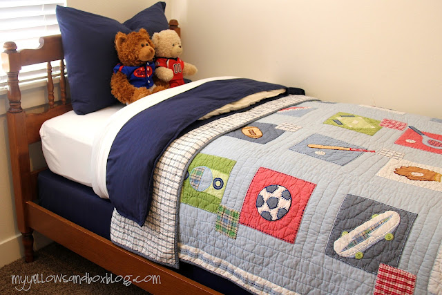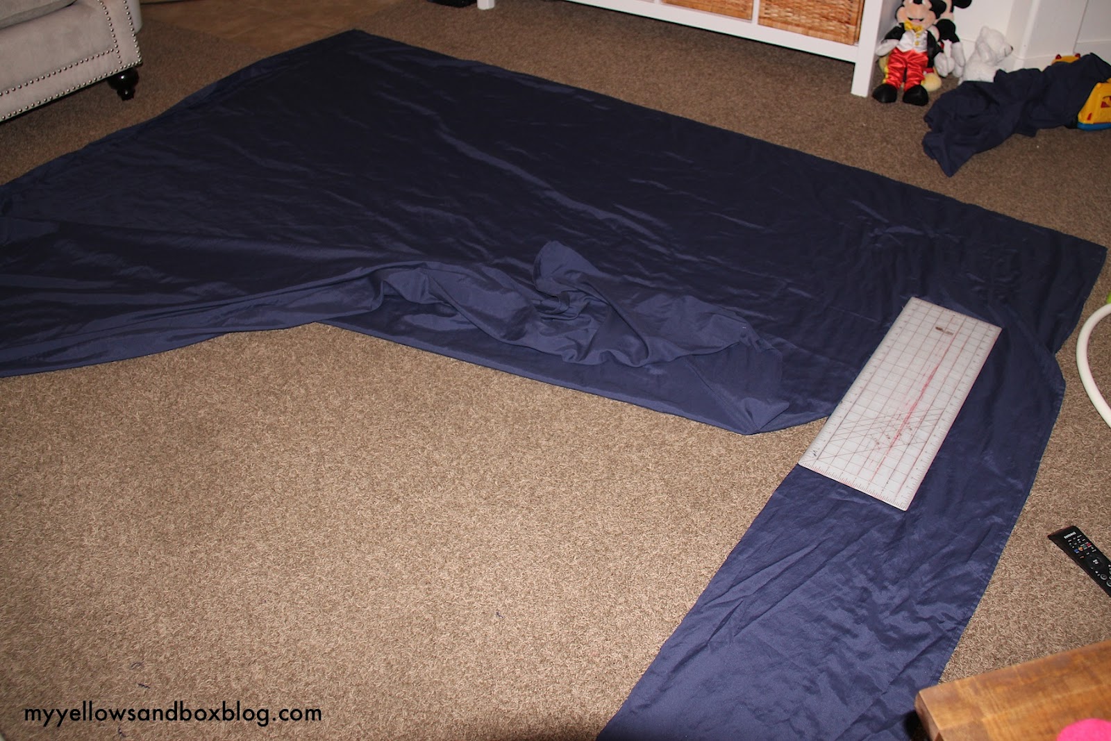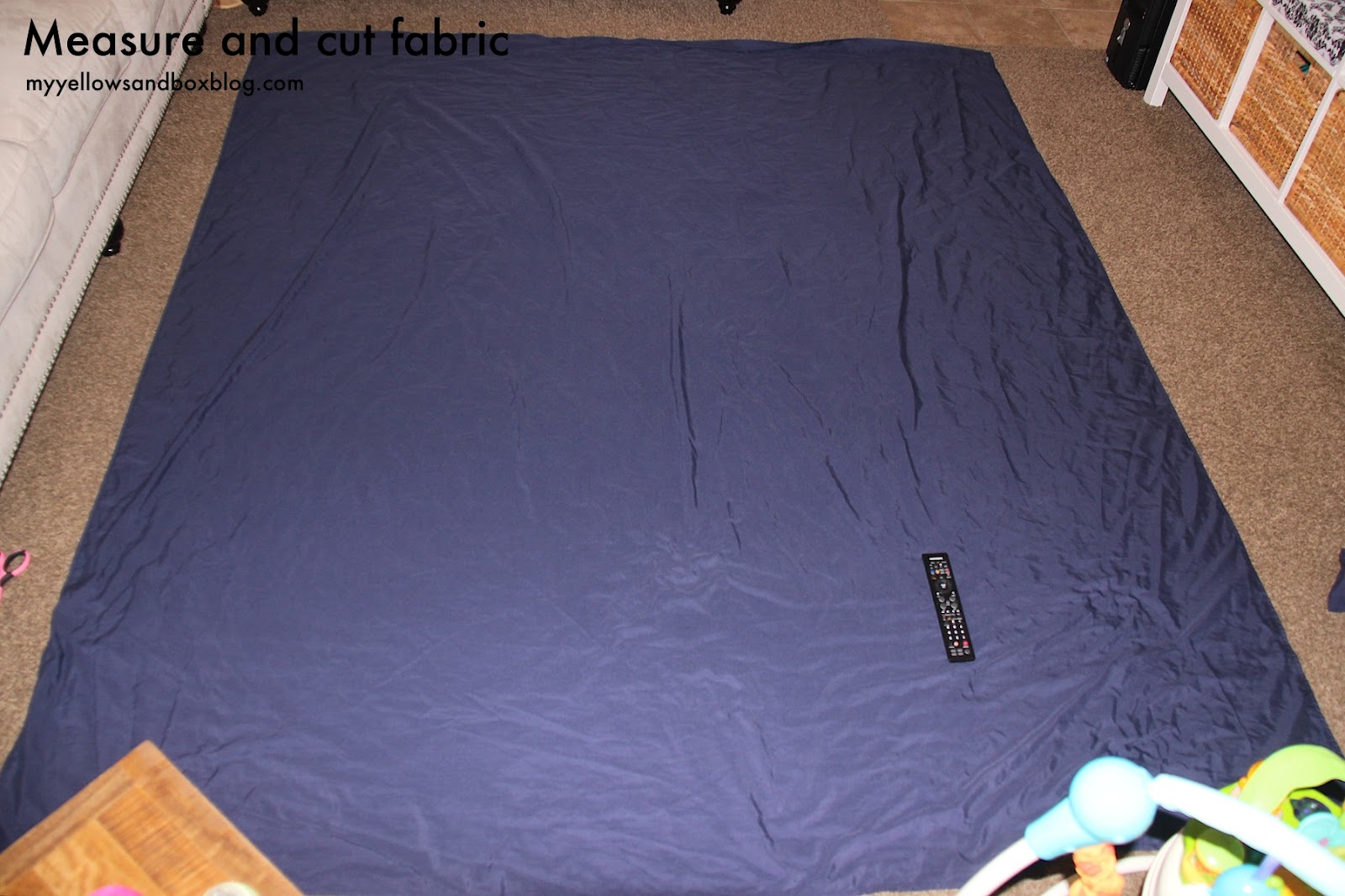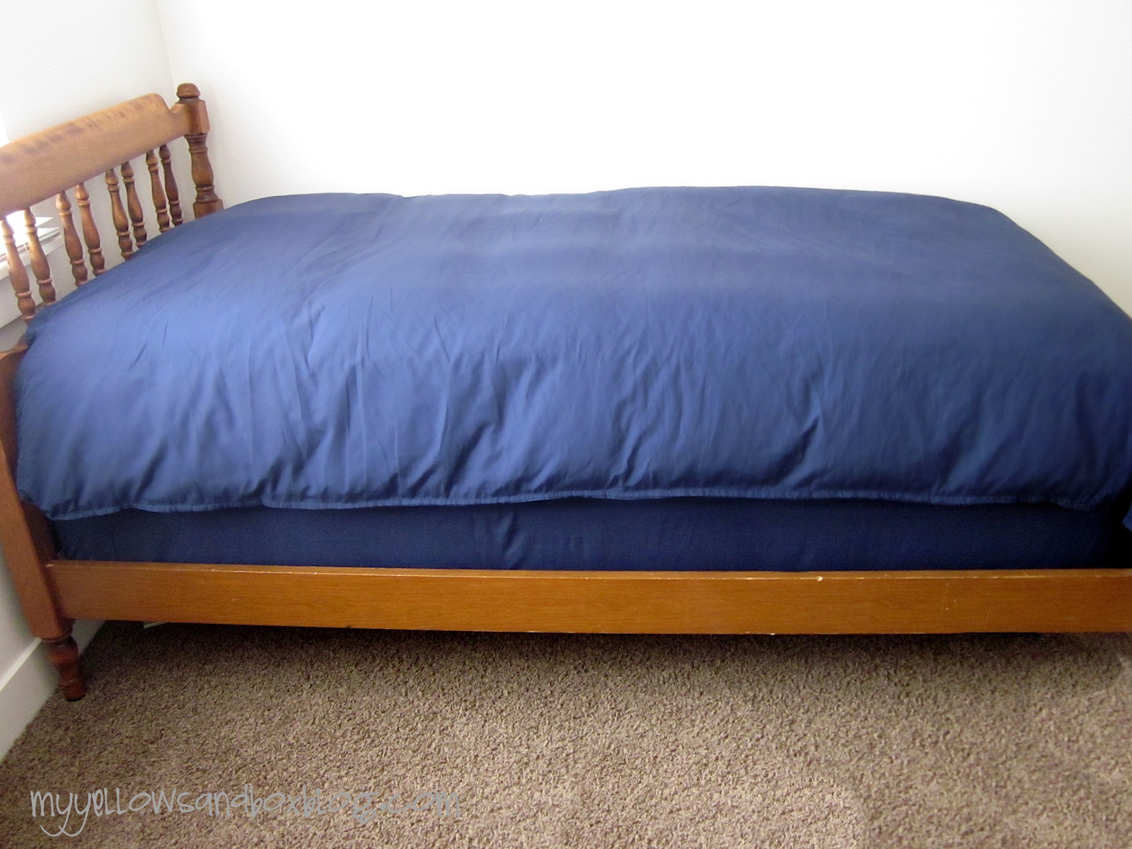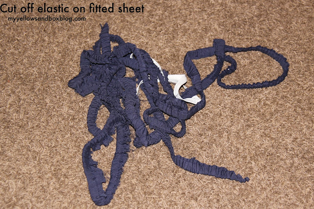I didn’t want to buy two sets of sheets and I was hoping to have extra fabric to upholster my ugly box springs. I found some Navy Blue Queen sheets on clearance for $20.00 and didn’t look back. I figured since a queen is so much bigger than a twin, I could cut up the fitted sheet and use that as my second sheet and use the leftovers of the flat sheet to upholster my box springs. Following me? I know this can all be a little confusing!