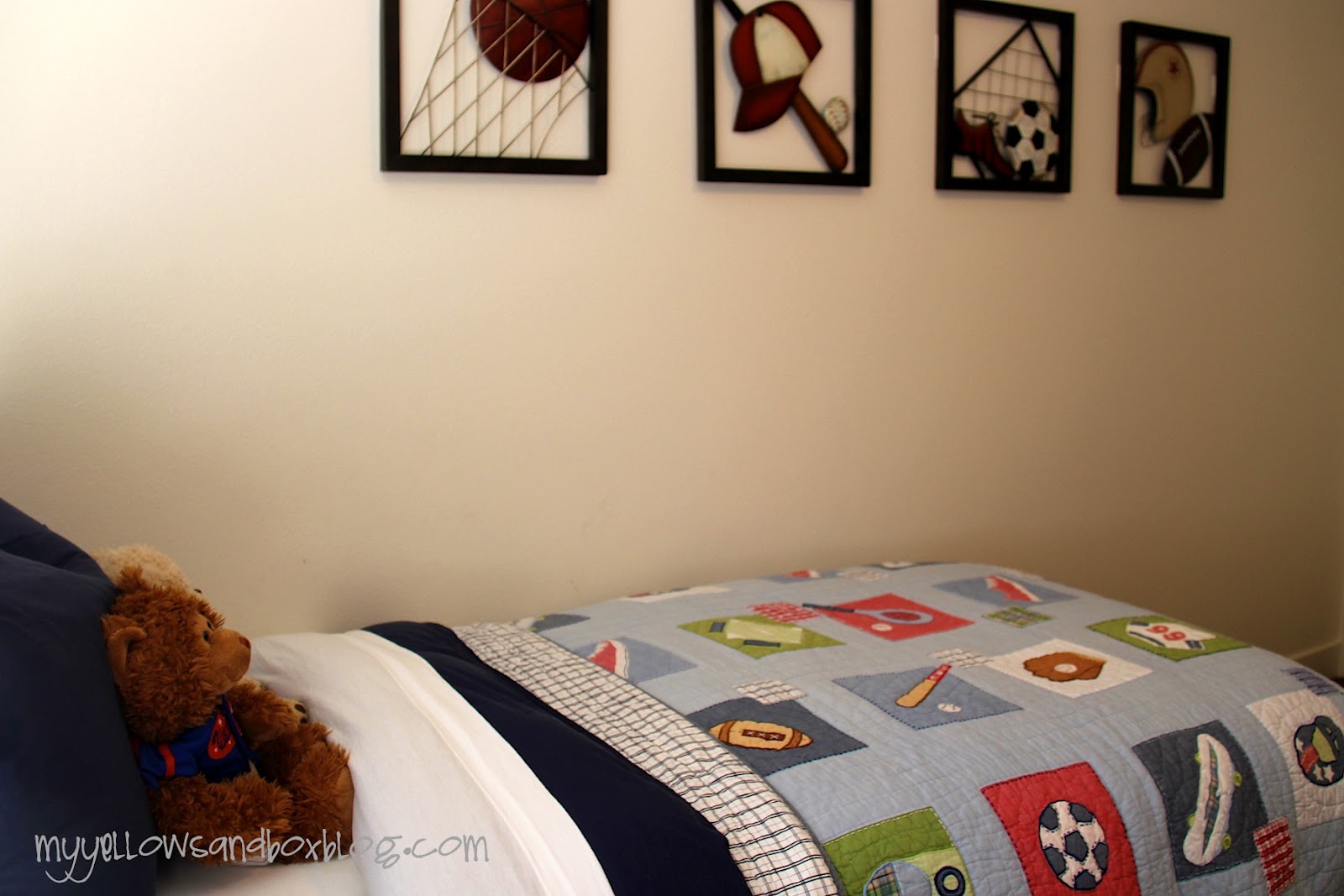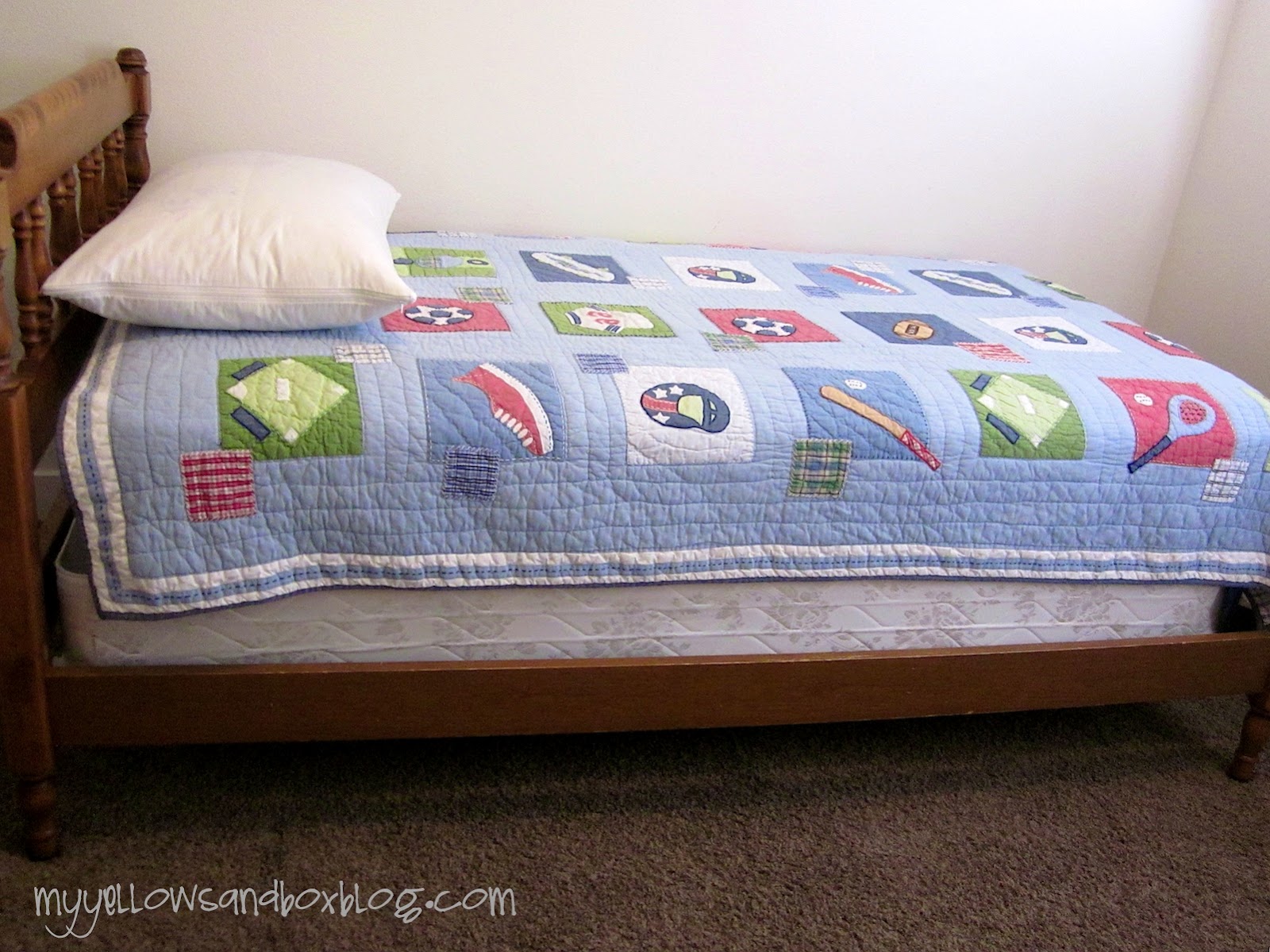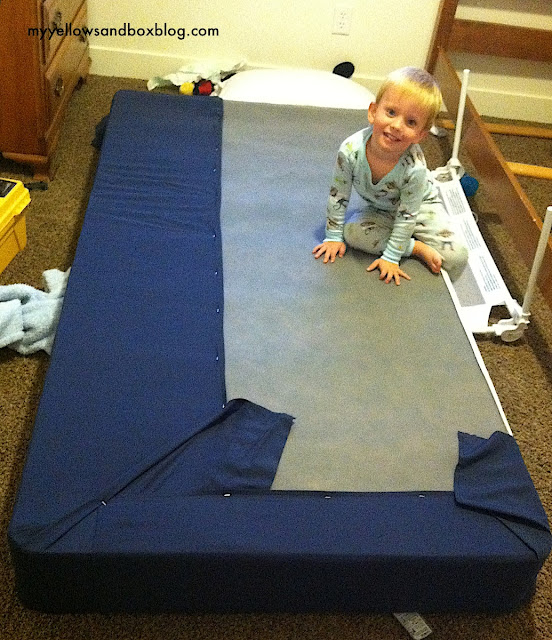 You jimmy rig yourself something that looks like this. I just ironed it and staple gunned it onto his box spring. It looks awesome. No one would EVVVER know it wasn’t a nice fitted sheet/bed skirt.