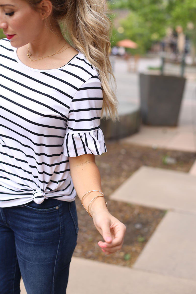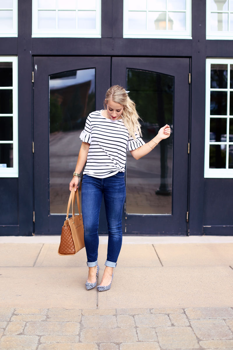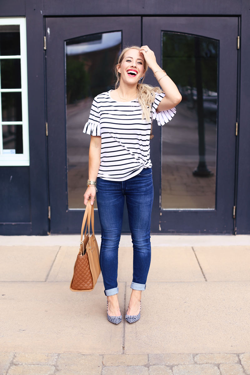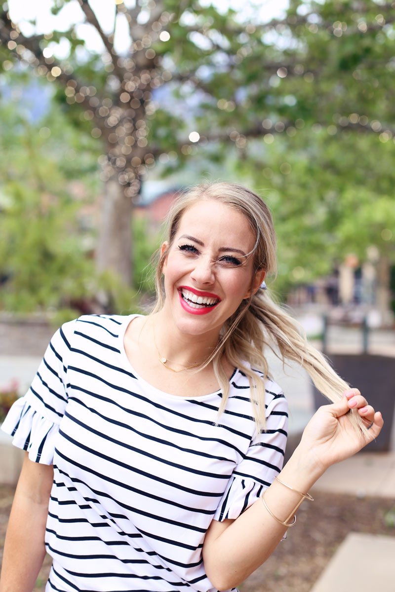Bell Sleeve Tee: stripes are sold out but they still have black and blue! Similar stripes here and here | Jeans: the ones I’m wearing are here and they’re suuuper expensive ?. I’m kind of embarrassed haha! I totally splurge on my jeans because I get so much use out of them and have a hard time finding a pair that fits! Some similar, more affordable options are here and here | Heels are old, the bow scrunchie is sold out | Necklace | Lip Color: LipSense Fusica | Bag: c/o Spartina 499, similar splurge and save.