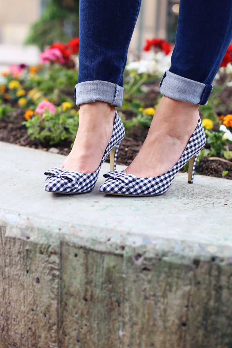 2. Mix patterns of different scales. Because my shirt has fairly large stripes, I’m going to look for something in my closet with a smaller print. It could be a small floral print, a small check or even a polka dot. The important thing though is to make sure the patterns have different scales. You don’t want two overwhelming patterns right next to each other! It was easy to add a pop of check in the shoe because they’re completely different scales!