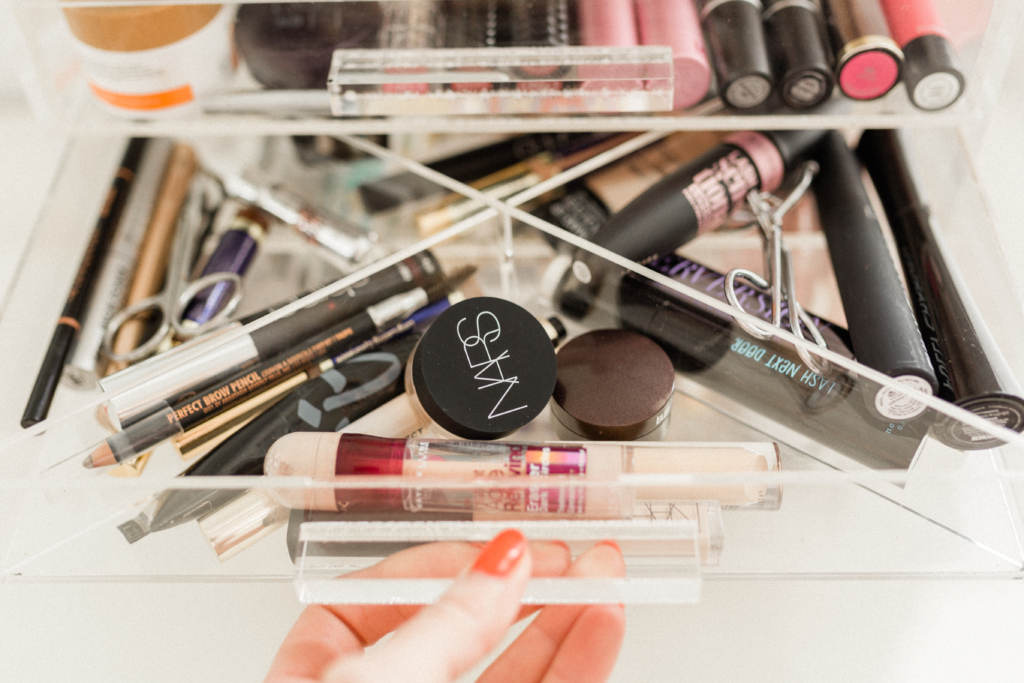 Find a table, counter or other washable surface and empty out your makeup bag or drawer. (Don’t dump it on your bed like I did once because it gets the makeup all over everything and it’s hard to clean off.) . Getting everything out of your bag will force you to pick everything up and make a decision whether there really is space in the drawer for that item, it’s a very Marie Kondo approach haha.