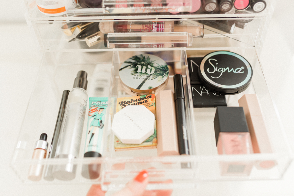 Because I use the Cosmo Cube (it’s pricey I know but a worth while investment), I like to organize by product type. I put my lipsticks in the top drawer, eye products in the second drawer, skin products in the third drawer and then bulkier items in the drawer on bottom. Having everything sorted and organized makes finding what I want super easy and quick!