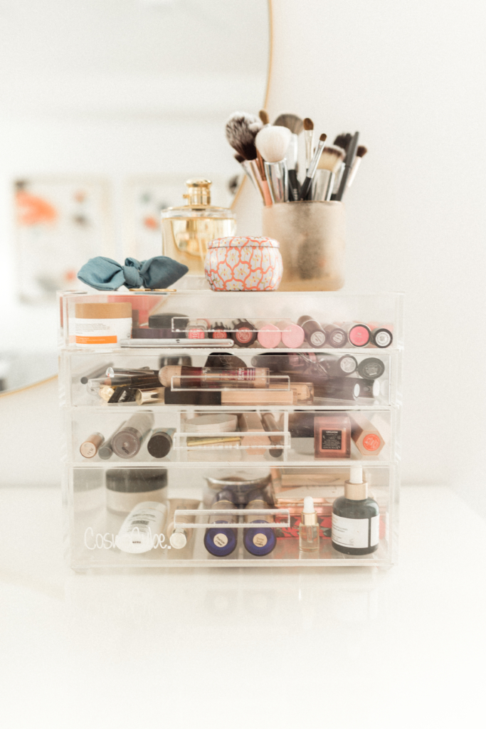 While the drawers are empty, take this opportunity to clean them. This will give you a fresh start when you are adding your items back in. If you don’t have drawers, either ditch your old makeup bag for a new one, or clean it out as best you can. If I can recommend, I’ve had this Cosmo Cube for a few years now and it’s held up so well. It looks so beautiful on my vanity and holds SO much makeup! I loved getting everything out of my bag and being able to truly organize my products vs throwing them all in a large bag.