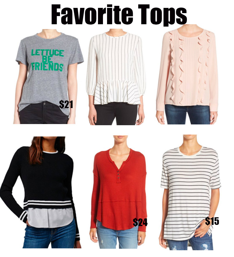 Lettuce Be Friends | Ruffle Blouse (this one’s going fast!) | Pink Ruffle Blouse | Mixed Sweater | Red Thermal Henley | Striped Tee >>> Also this white tee is perfect!