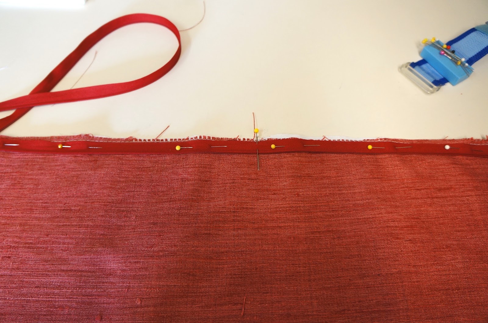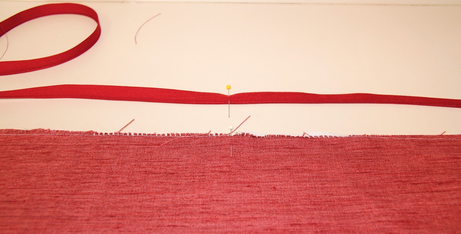 Now, making sure your zipper is unzipped lay it upside down on the right side of your fabric and pin it. The entire zipper should be laying on your fabric and you should be able to see the seams in your zipper where you uncurled the teeth.