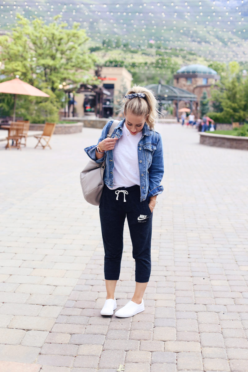 Lately I’ve been LIVING in these Nike sweats. Literally living in them. They’re so dang comfy! And then this white shirt is ??, a summer staple for sure. It’s a little bit looser, just how I like them, and because of the higher neckline you don’t need to wear an undershirt with it! I’ve linked to everything in the widget below if you’re interested in snagging anything! Oh man do I love the athleisure trend right now though. Getting away with wearing sweats in public is SO my jam!