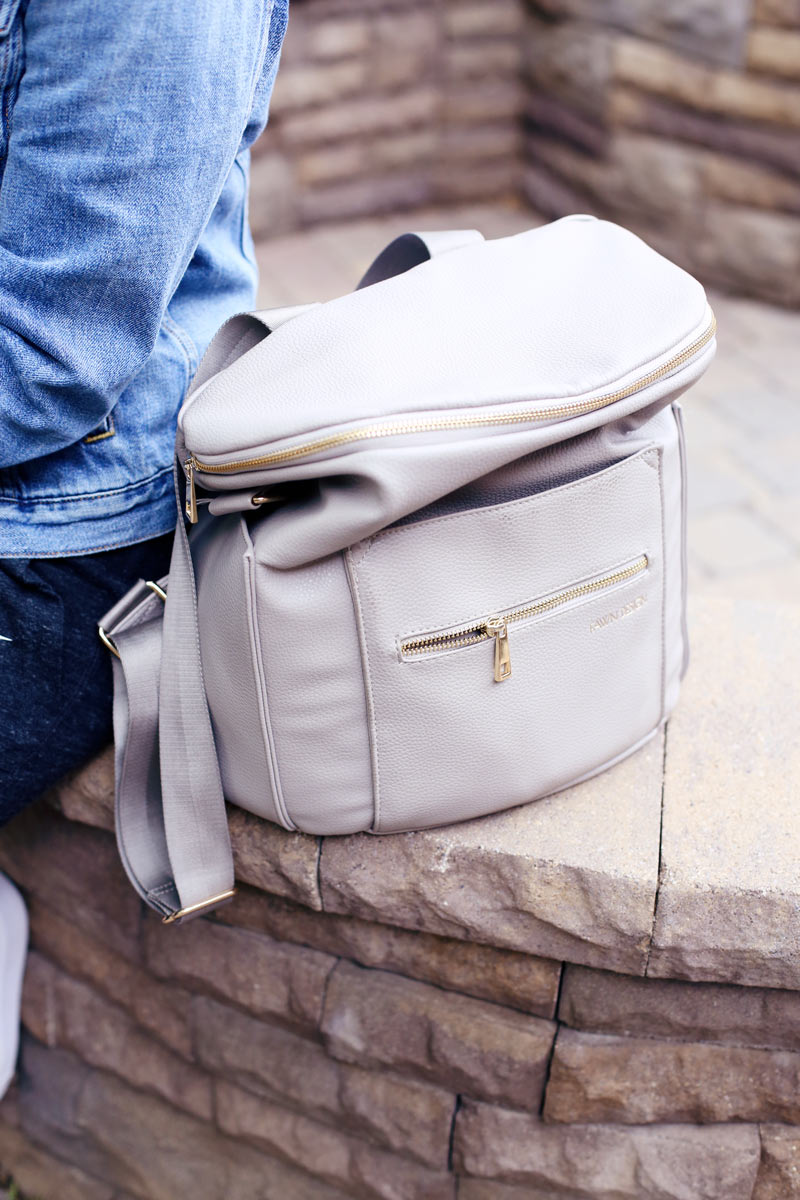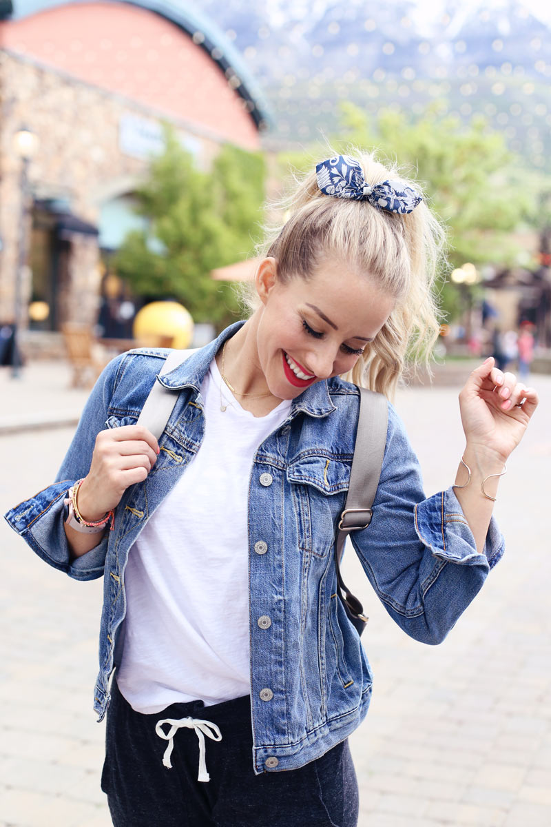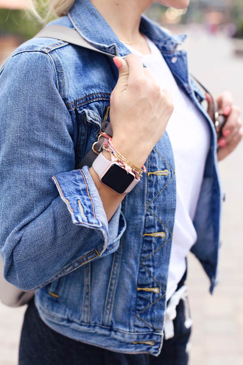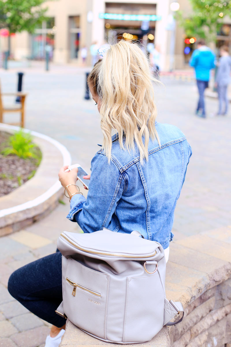 Nike sweats | White shirt | Denim Jacket | White Sneakers, sold out!!! Similar here | Fawn Design Diaper Bag in stone | Apple Watch | Bracelets here and here | Cage Bracelet | Hair Scrunchy, also love these ones here | Geo Necklace | Lip color: LipSense Fuscia