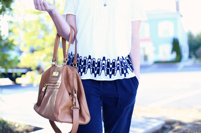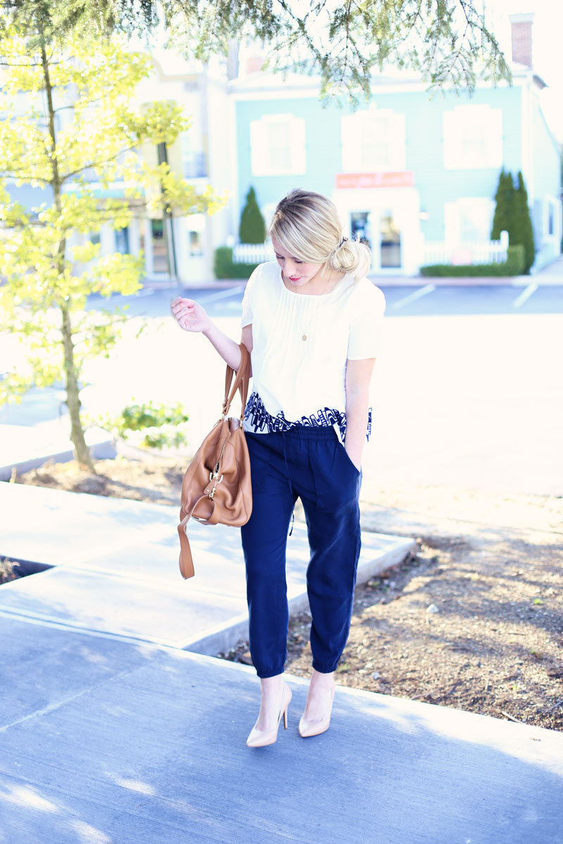 Heels (These are the ones I was wearing Sunday you guys were asking about!) | Bag: c/o Cluadine and Ash, the andie | Top: Swing Top – sold out but similar Ae Tee & Lace Peplum | Pants: Tencel Joggers – sold out but similar summer ones here