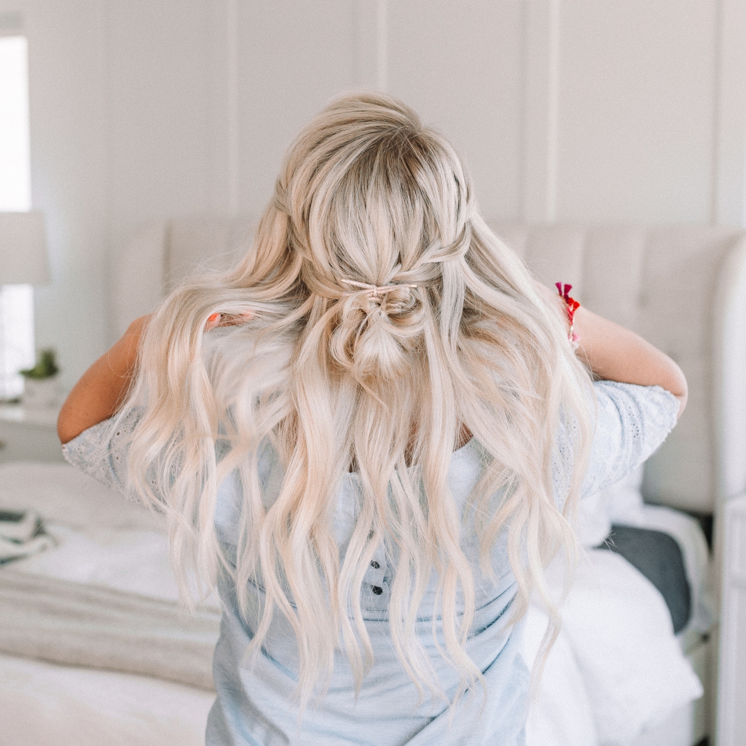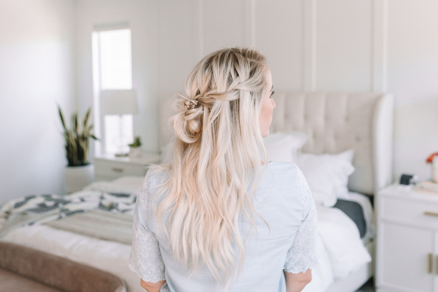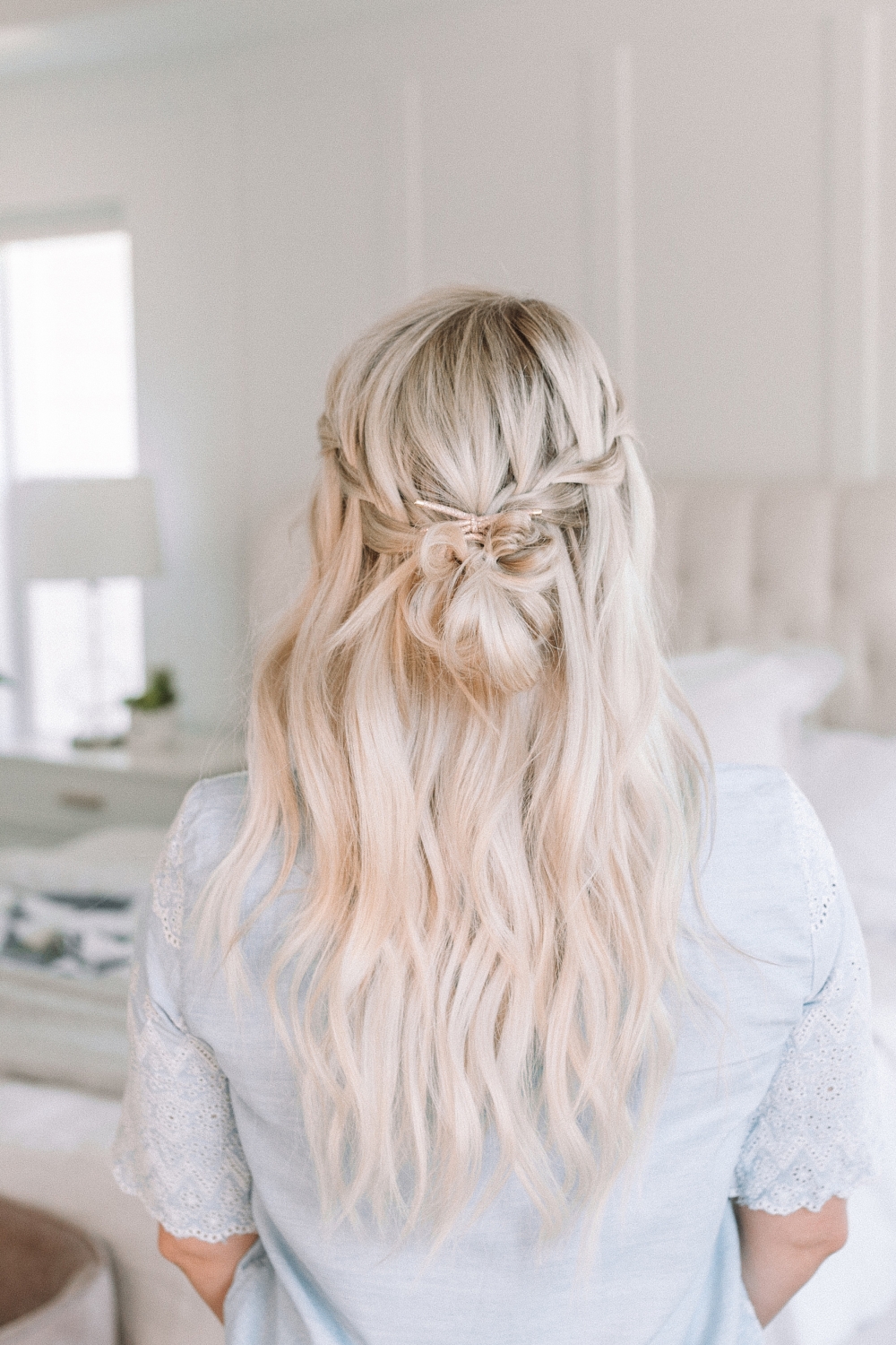 And last but not least we have the Waterfall Half Up-Do. Out of all the hairstyles we’ve done I’m calling this one my very favorite. There I said it! It’s just a preference of mine to keep some hair down so I’m really drawn to the half-up styles. This is two waterfall braids that have come together in a really cute messy bun. Tell me it’s not beautiful, I DARE YOU!
