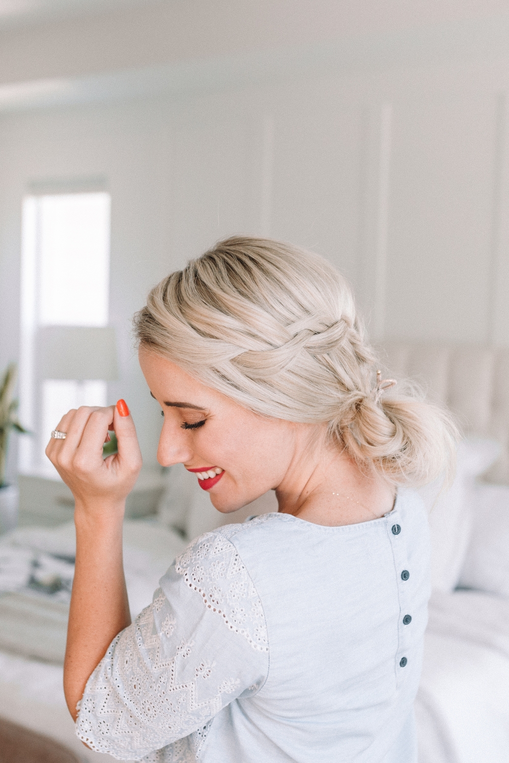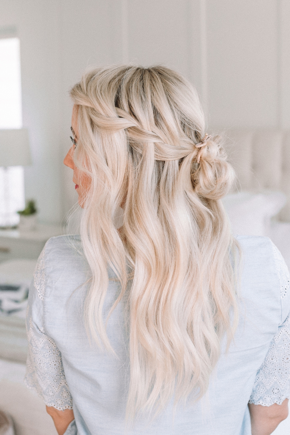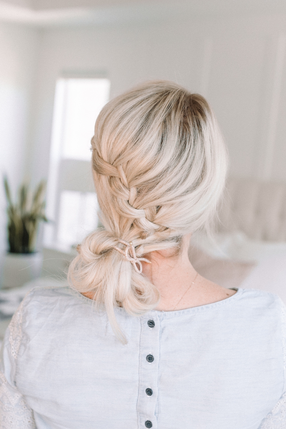 One way to finish off the side swept waterfall braid is to pull it into a low messy bun. You can make this a neater bun for a more formal hairstyle or add your favorite braid to the ends!