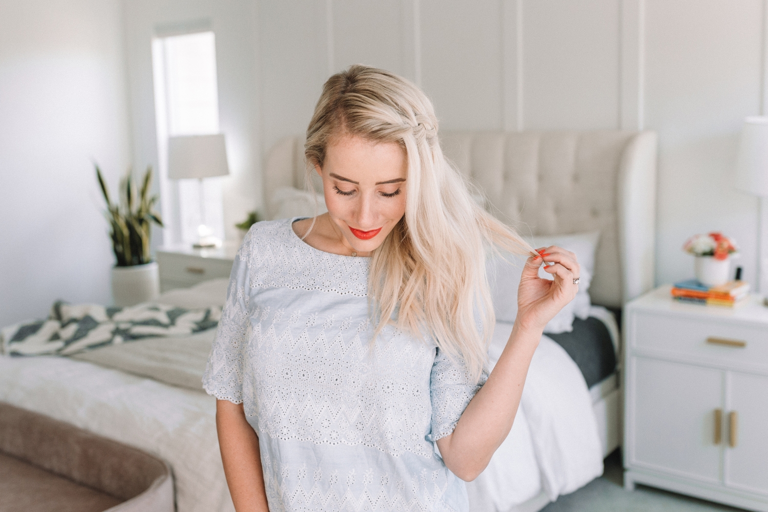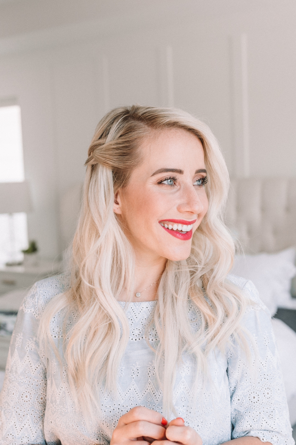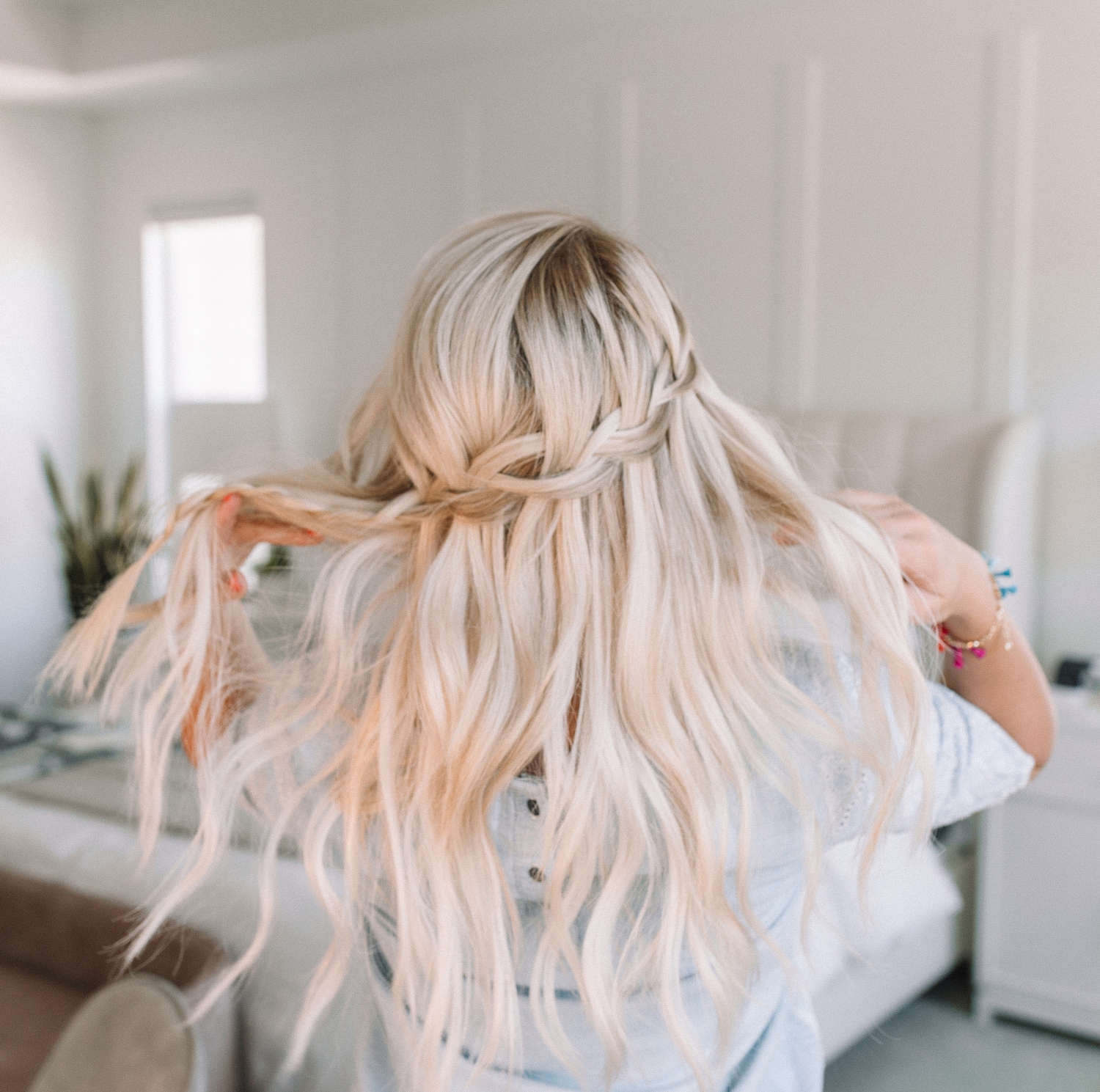 We are heading into our last week of the Learn How To Braid Challenge — I can’t even believe it’s already here! How has it been for you so far? Have you actually learned how to braid?! Or maybe added a few new hairstyles to your repertoire?! Well I’m super pumped for this week because it’s alllllll about the waterfall braid. Honestly I haven’t done a waterfall braid in ages so filming these videos was so fun for me! The dutch braid became super popular a few years ago and ever since then, I feel like the world (myself included) has forgotten just how beautiful and easy the waterfall braid is! So we’re bringing it back this week guys and I hope you’re excited about it!