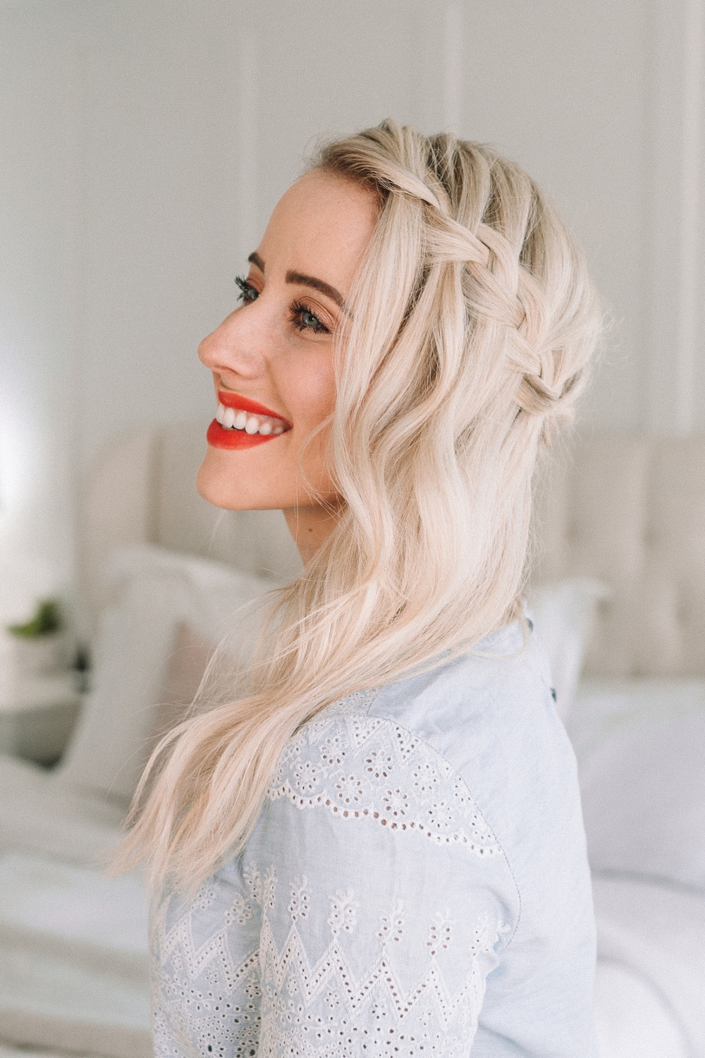 The waterfall braid seems tricky but it’s actually very easy once you know what you’re doing. If you can master the french braid, then you’re already half way there. In a waterfall braid you braid the outer sections of hair over the middle piece just like in a french braid. However, after each stitch you drop the bottom section and replace it with a new one. So don’t be nervous!