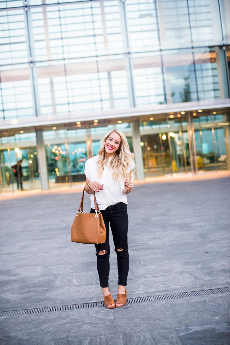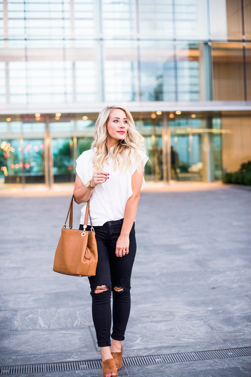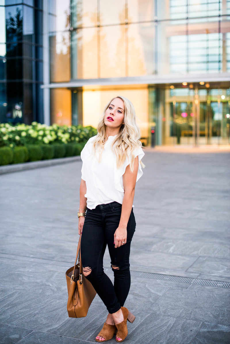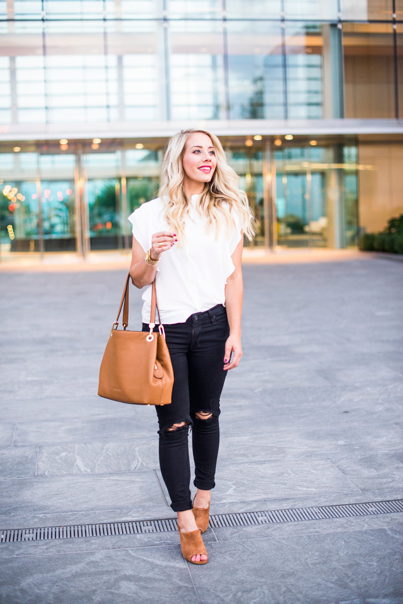 White Blouse | Black Jeans, these are my new favorite ones here. They’re so dang comfy! | Block Sandal. Also obsessed with these mules here! | Large Tote | Lips: Fire-N-Ice (navigate lipsense and then choose your color. If you’re new to lipsense make sure your snagging a glossy gloss too!)
