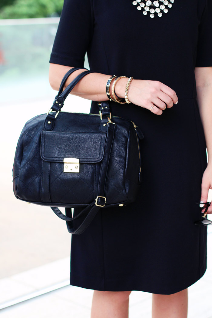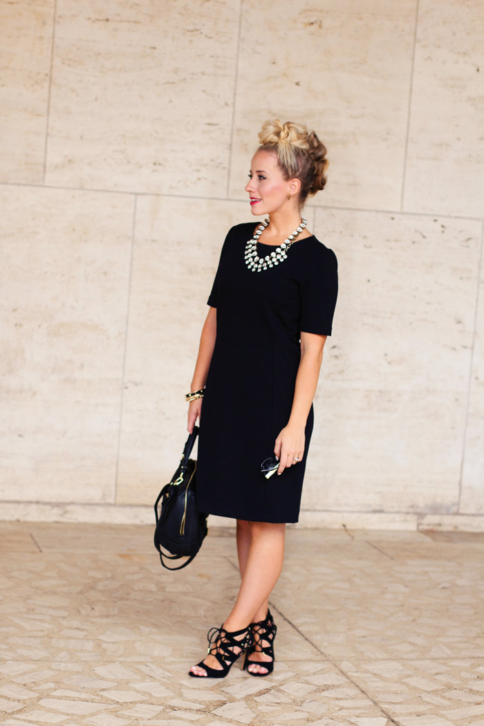 DRESS: JCrew Factory (on clearance right now! If you don’t have a classic black dress, you need this one!) | CAGED HEELS: Dolce Vita (super clearance!) | BAG: Target | NECKLACES: c/o Mindy Mae’s Market here and here. Similar here | BRACELETS: Old. Similar black studded bracelet here, gold bangles I’m loving here, here and here | SUNGLASSES: Kate Spade here | EARRINGS: c/o Sole Society | RINGS: c/o Sole Society | LIPSTICK: Mac Russian Red