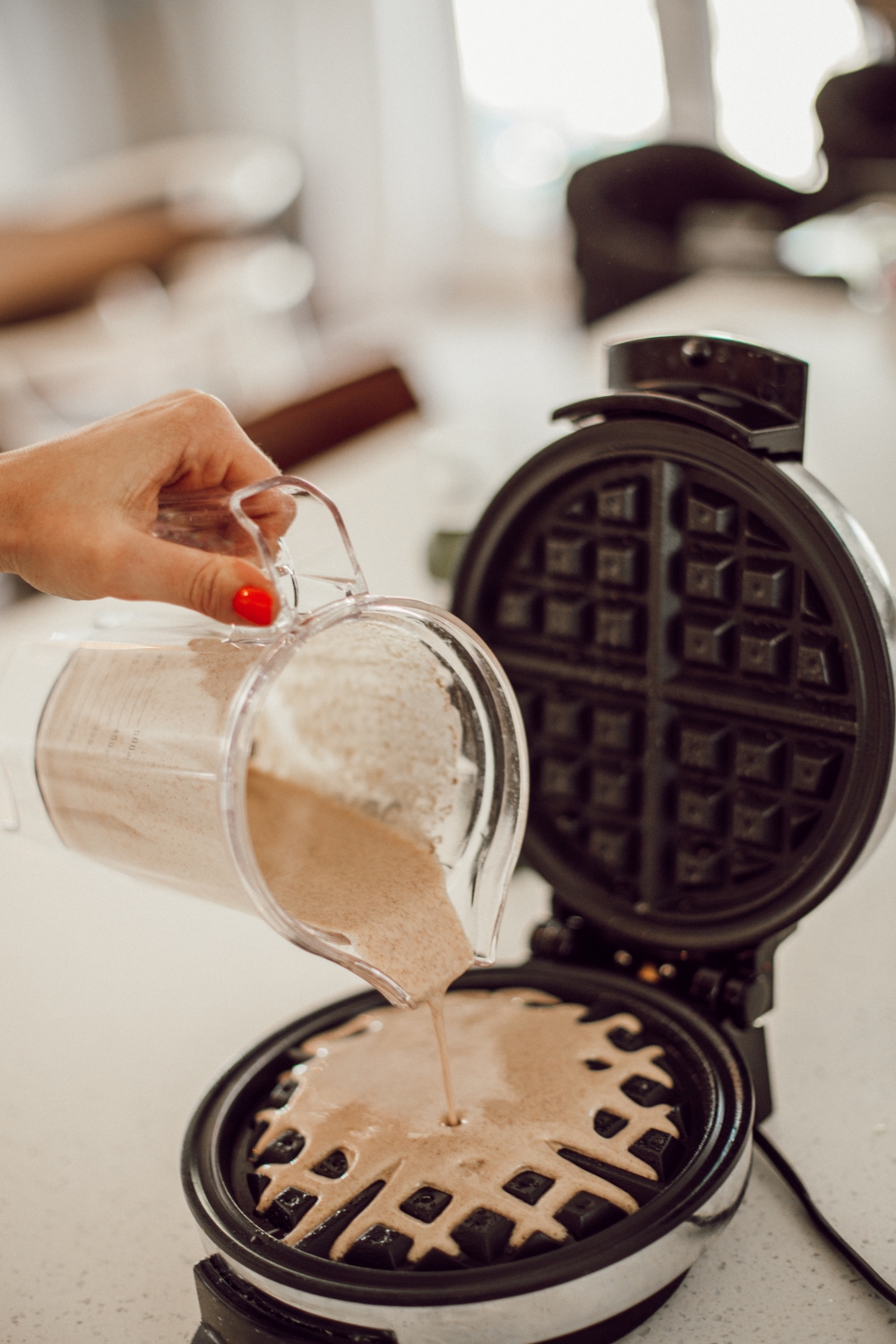 Then I pour my batter in slowly so that it doesn’t run over the sides and this entire recipe should yield one waffle.